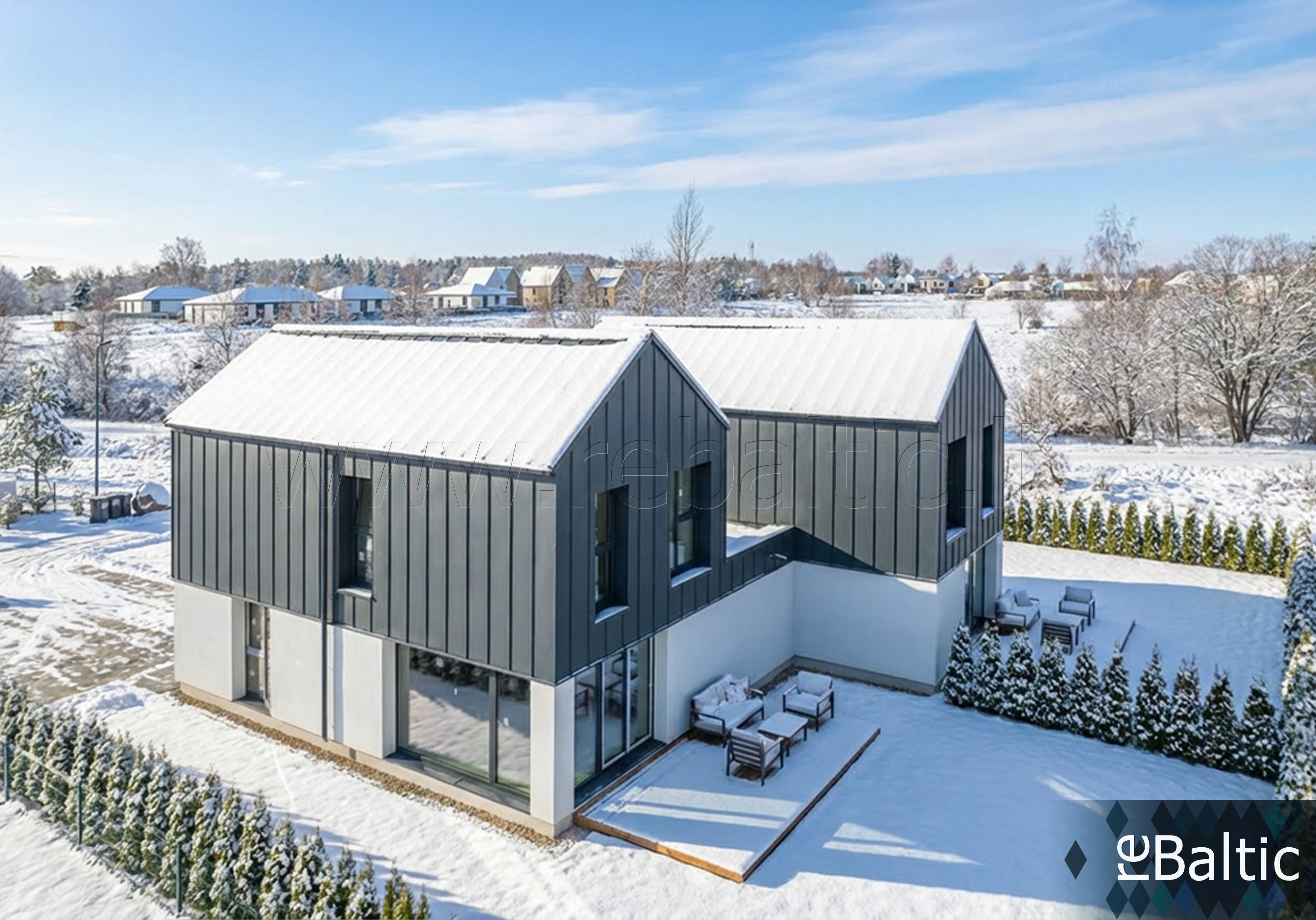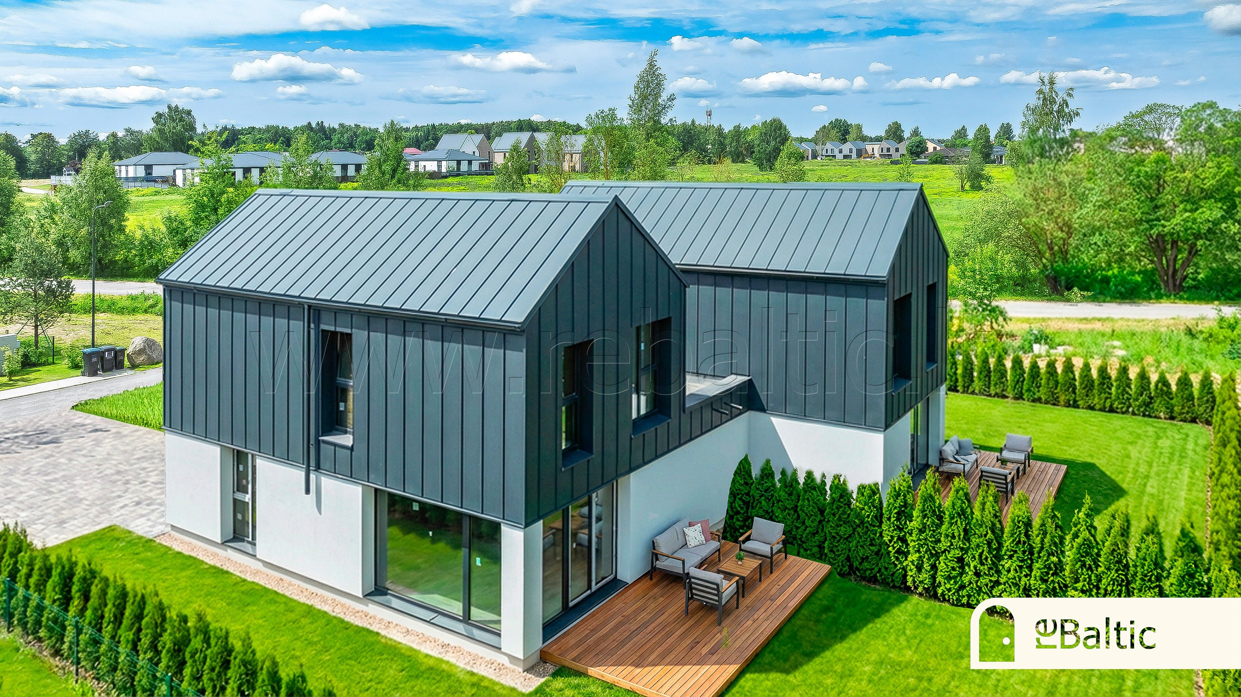 Parduodamas modernus 2025 metų statybos 5 kambarių (3-4 miegamųjų) A++ energinio naudingumo klasės dvibutis kotedžas su terasa ir žaliuojančiu kiemu.