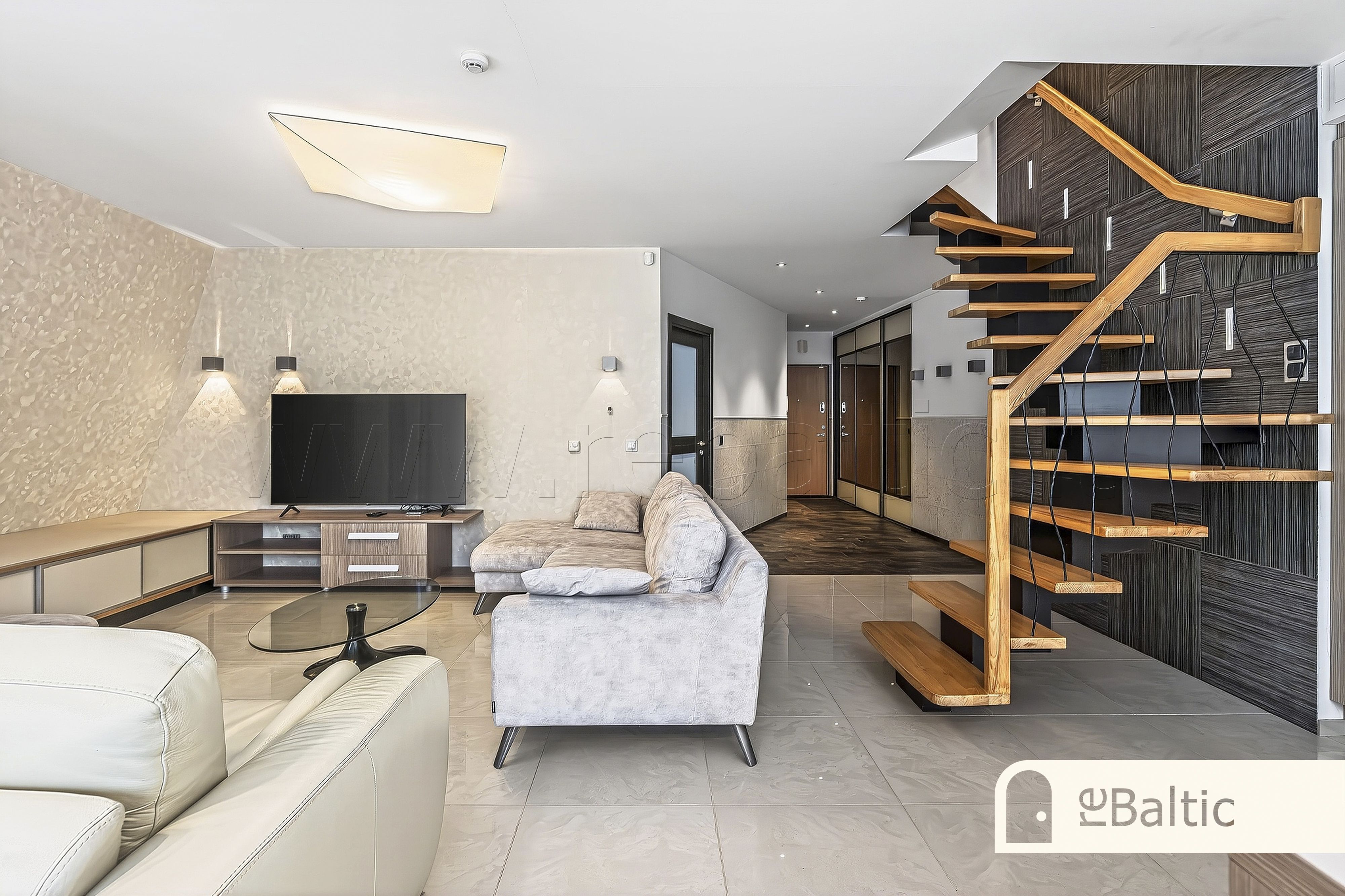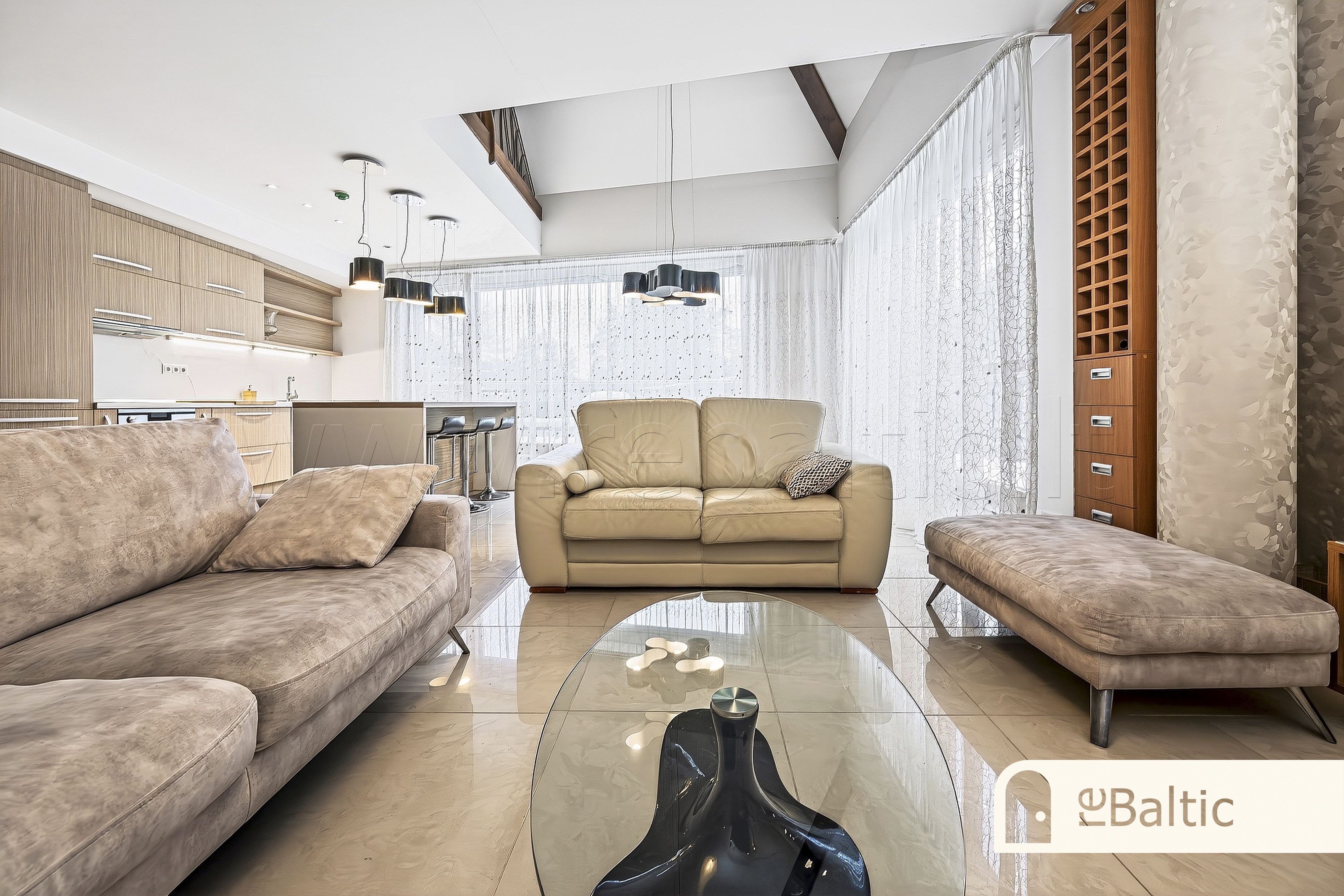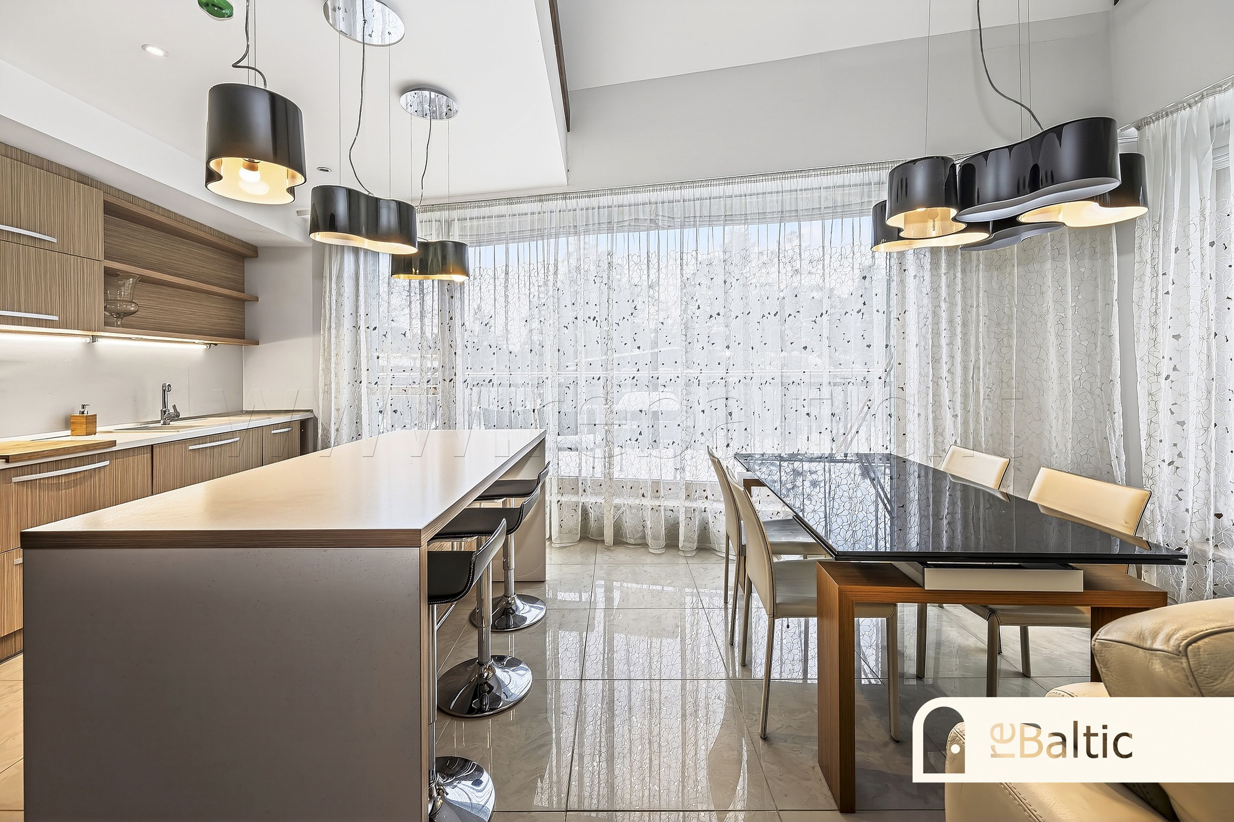 Didelis balkonas juosiantis svetainės ir virtuvės zoną.