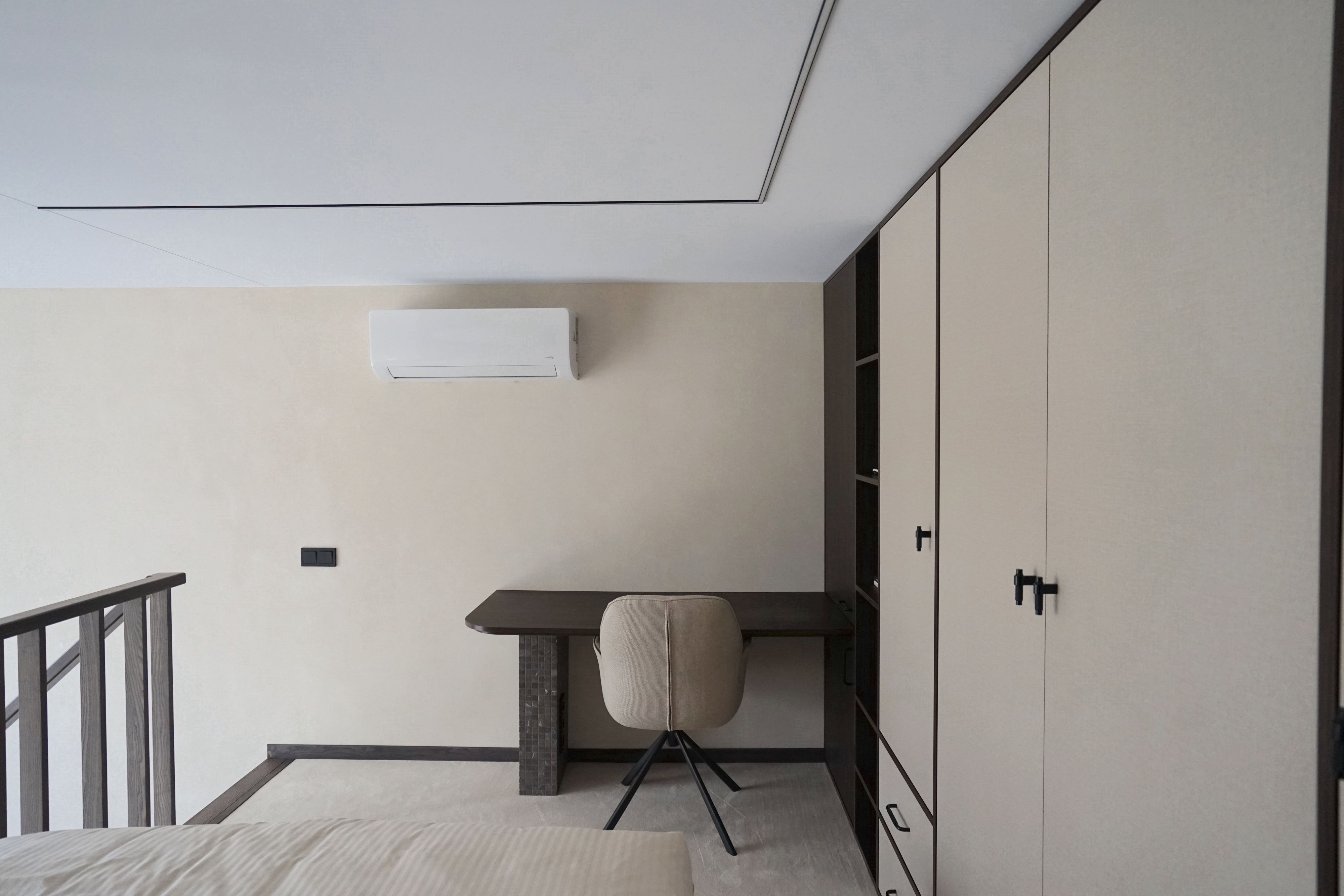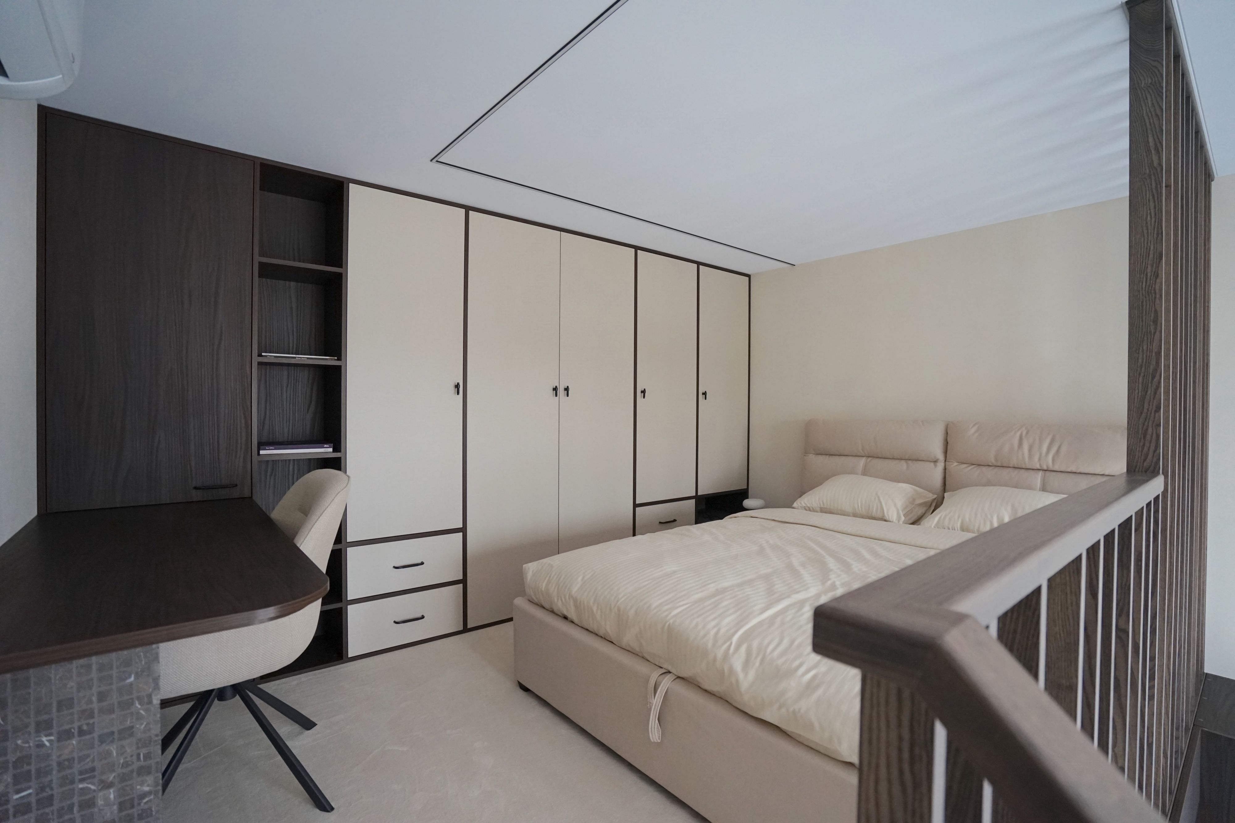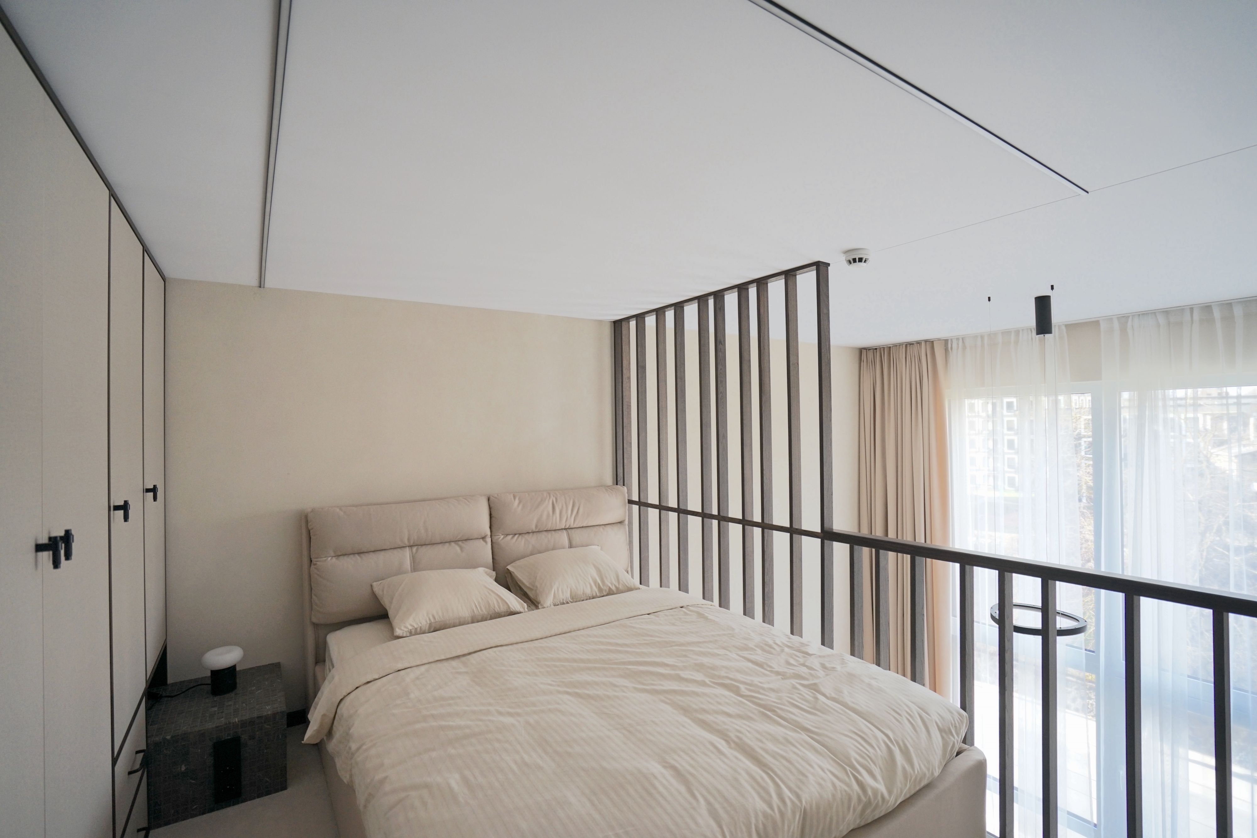 Viršuje — miegamasis su darbo vieta. Privatumas ir tvarka, nepamirštant maksimalaus jaukumo.