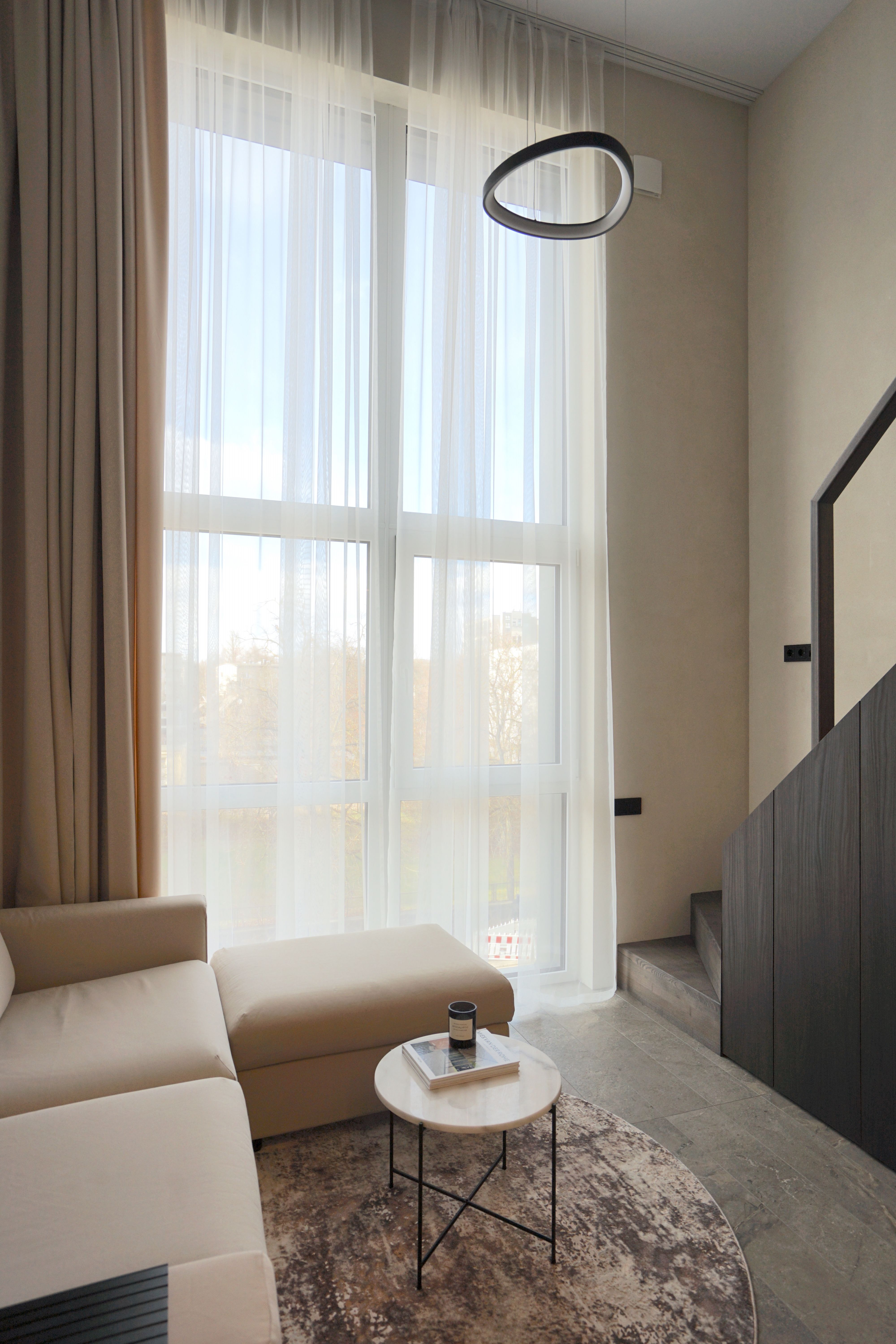 Didelis vitrininis langas užpildo erdvę dienos šviesa, o atvira lubų erdvė suteikia įspūdį, kad butas daug didesnis.