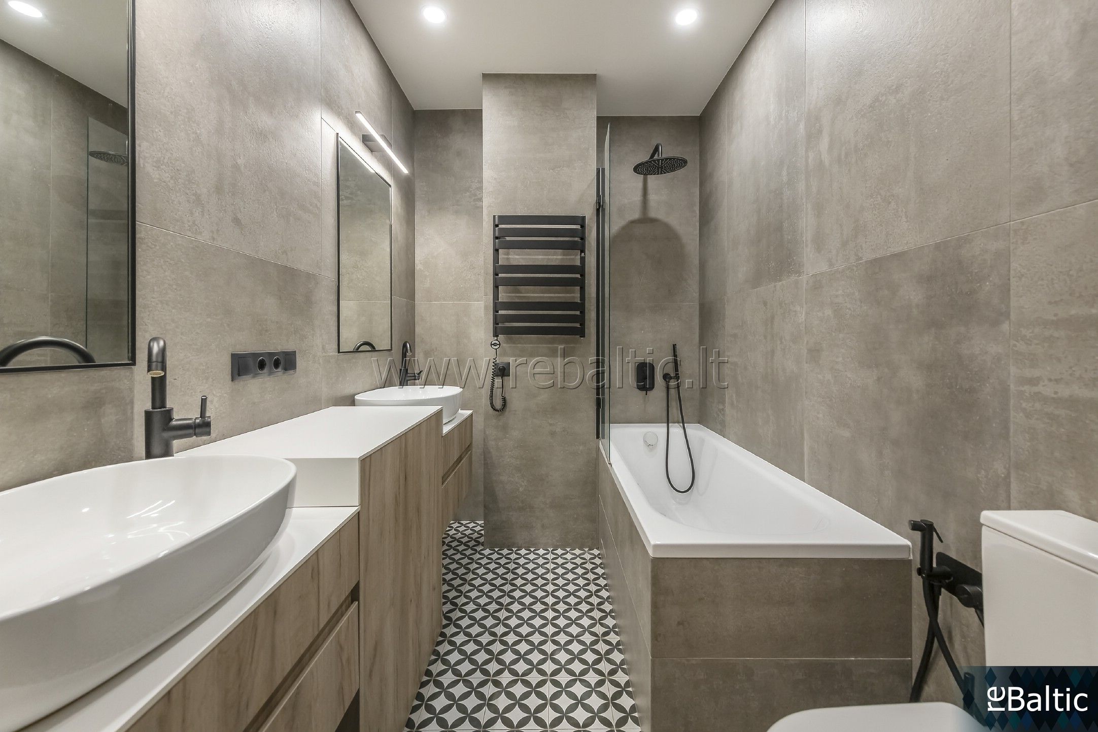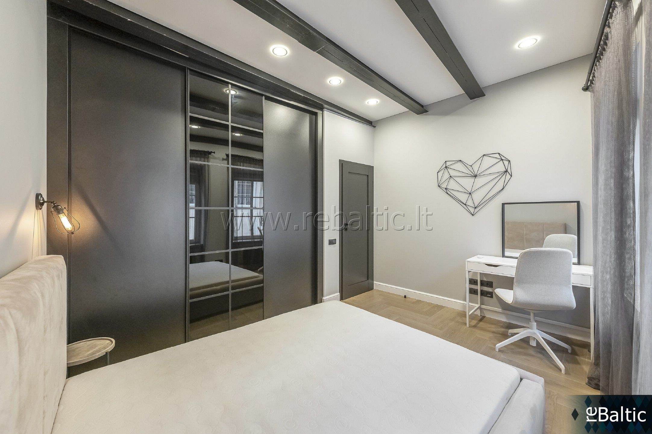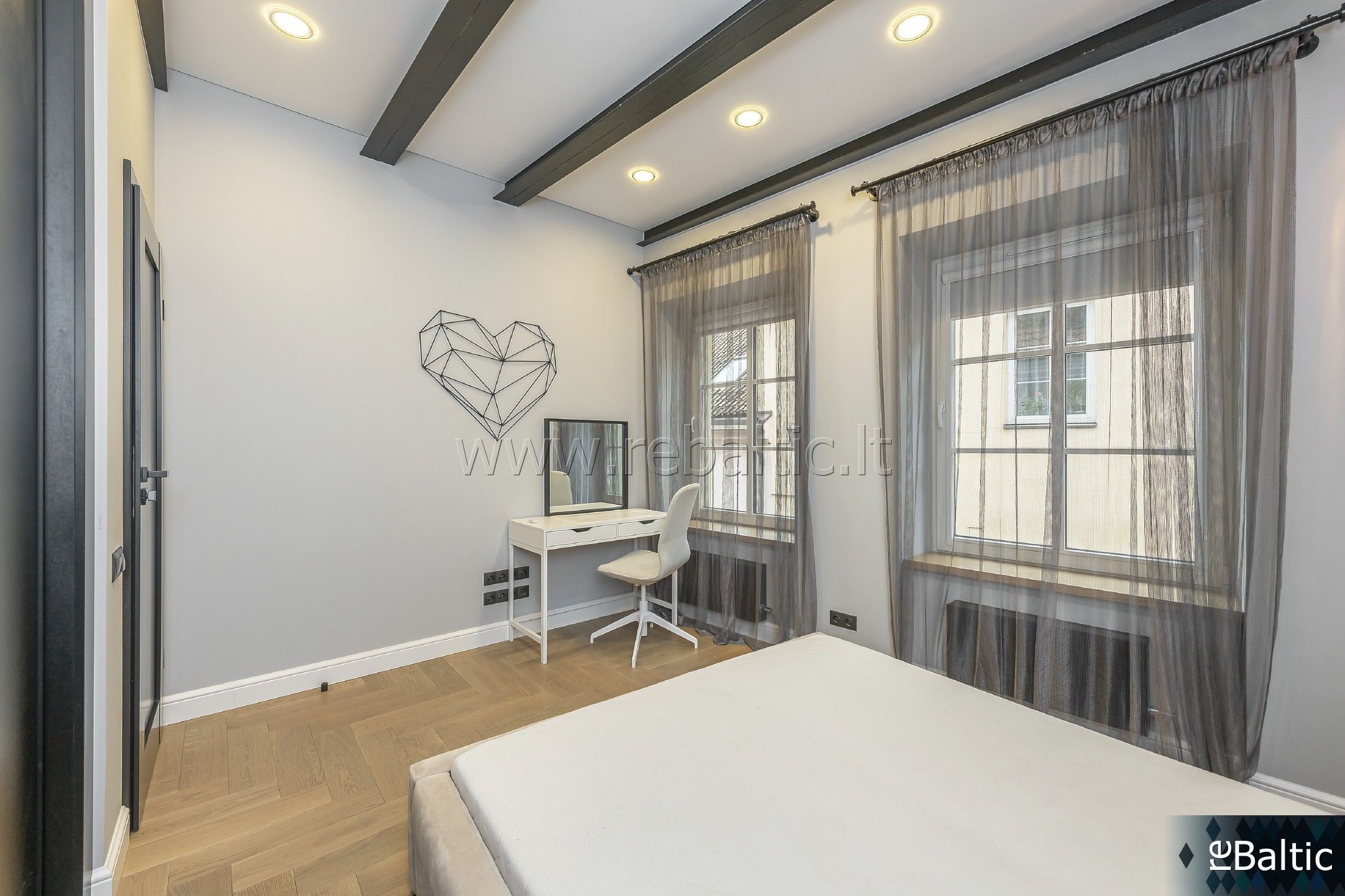 - Grindys: medinės parketlentės ; vonios ir virtuvės zonoje - šildomos plytelės
