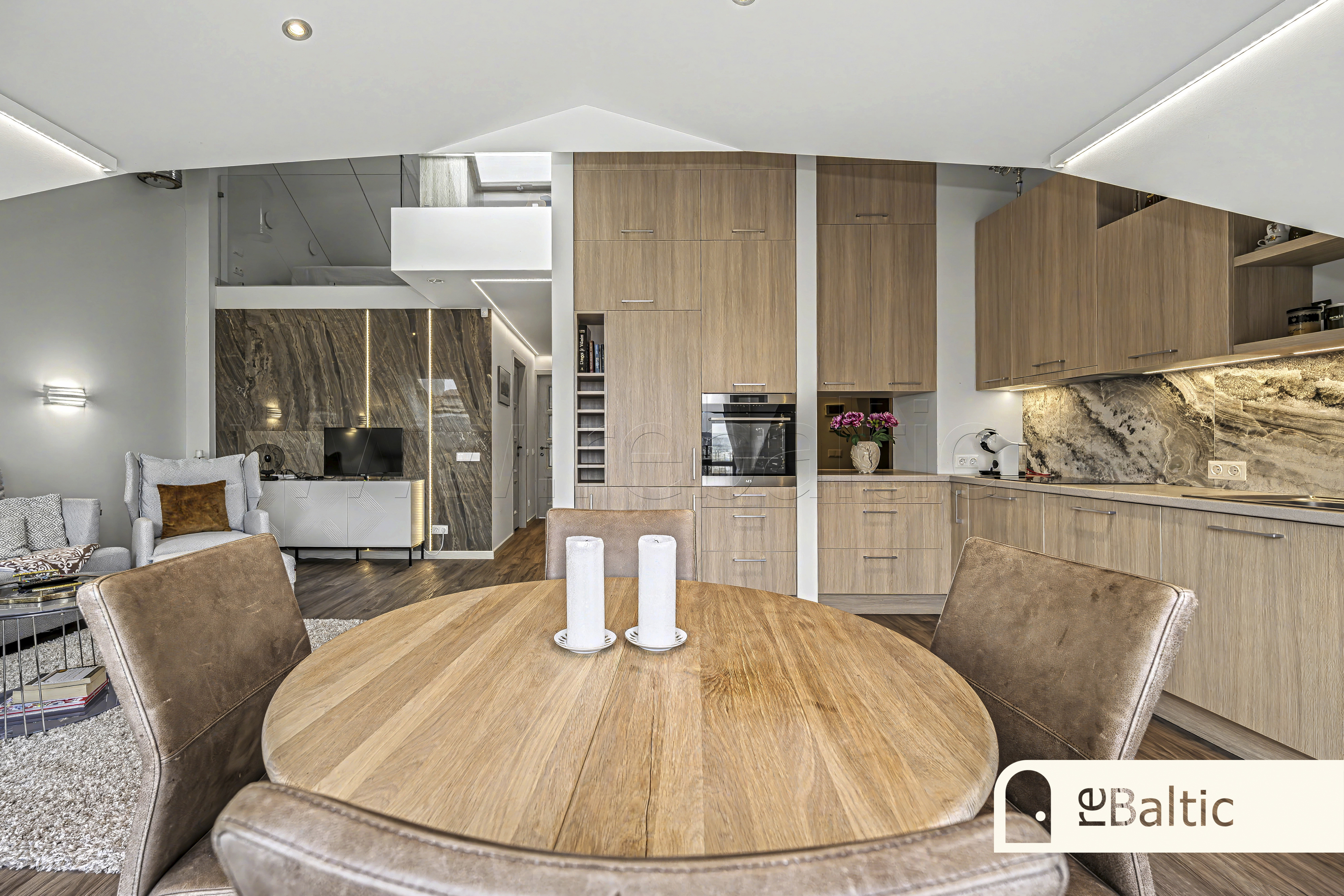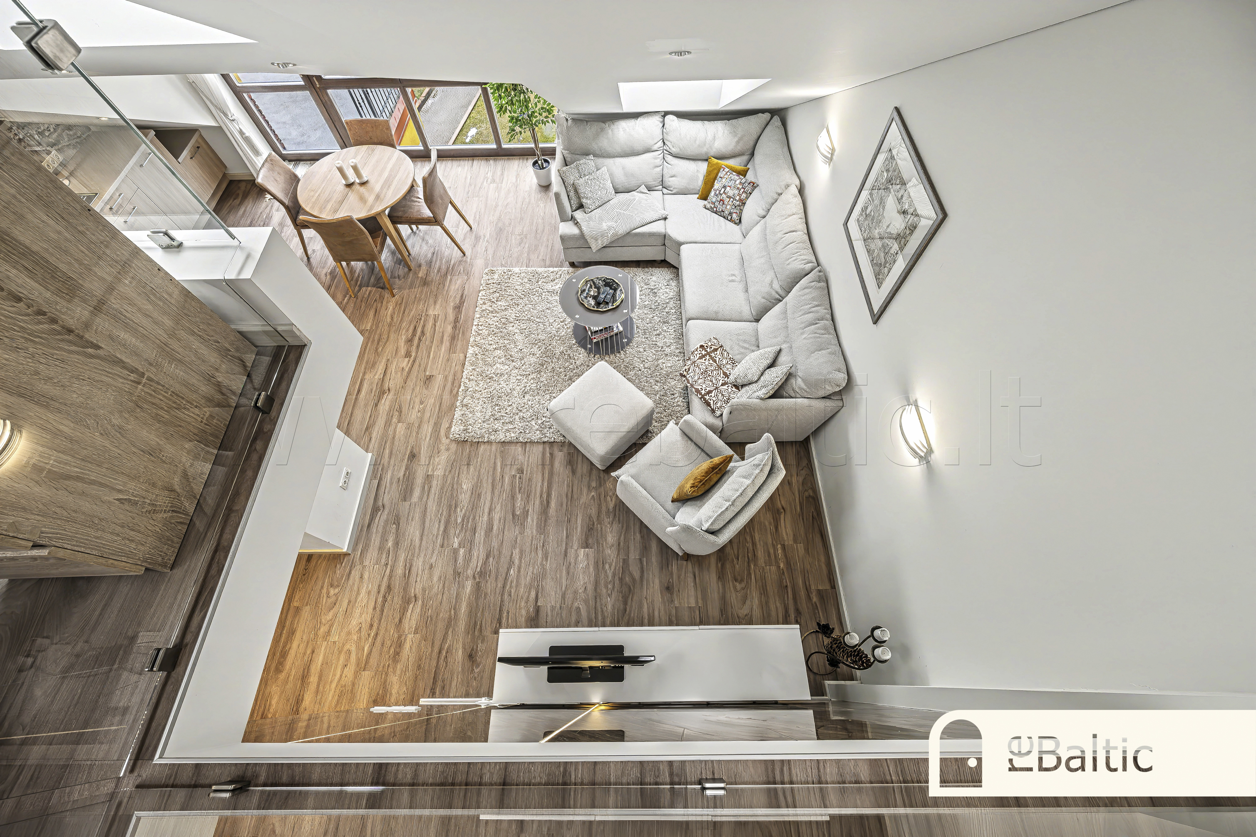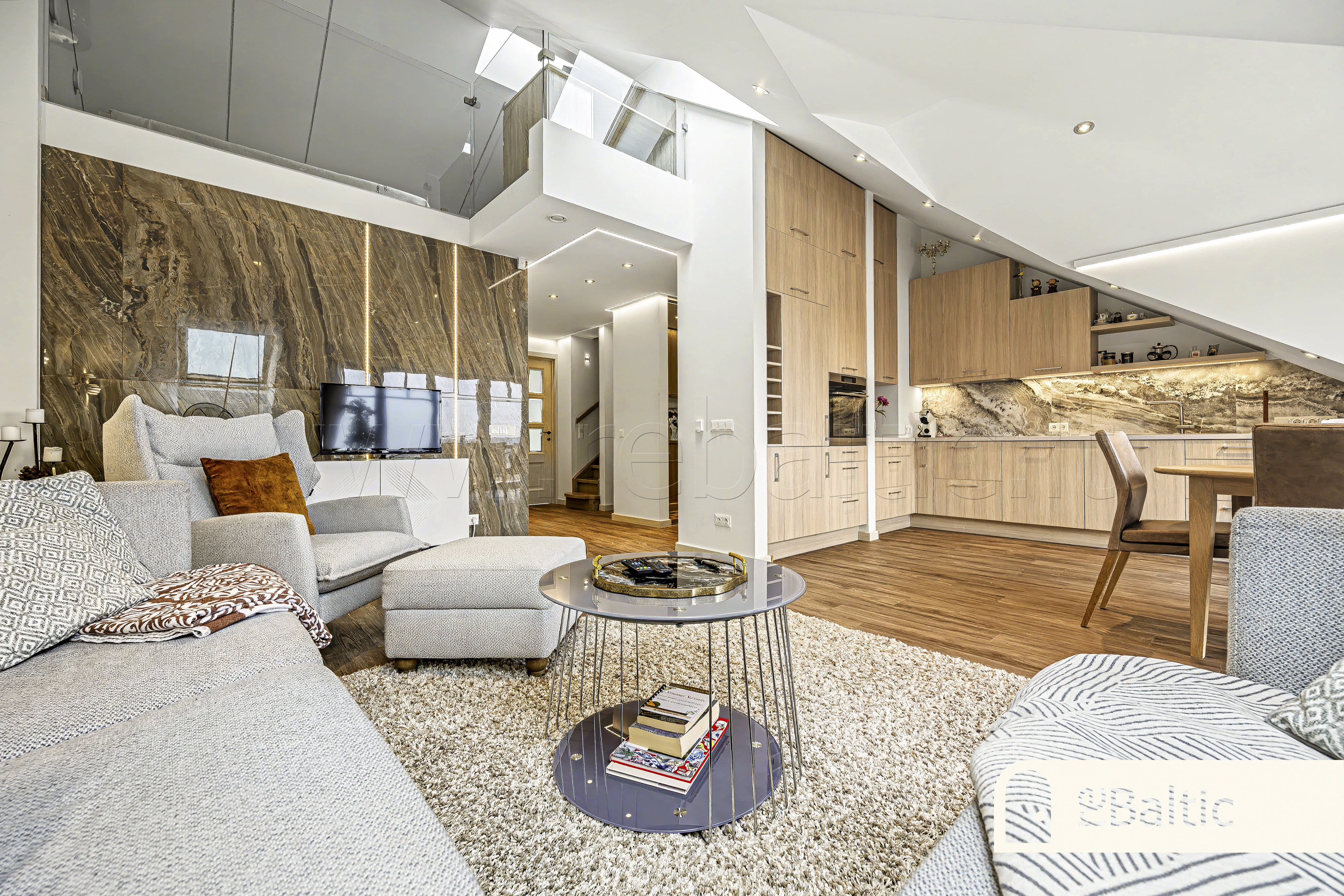 Erdvi svetainė, sujungta su virtuve. Išskirtinė terasa su unikaliais vaizdais. Antrajame aukšte esantis darbo kambarys garantuoja visišką ramybę susikaupimui.