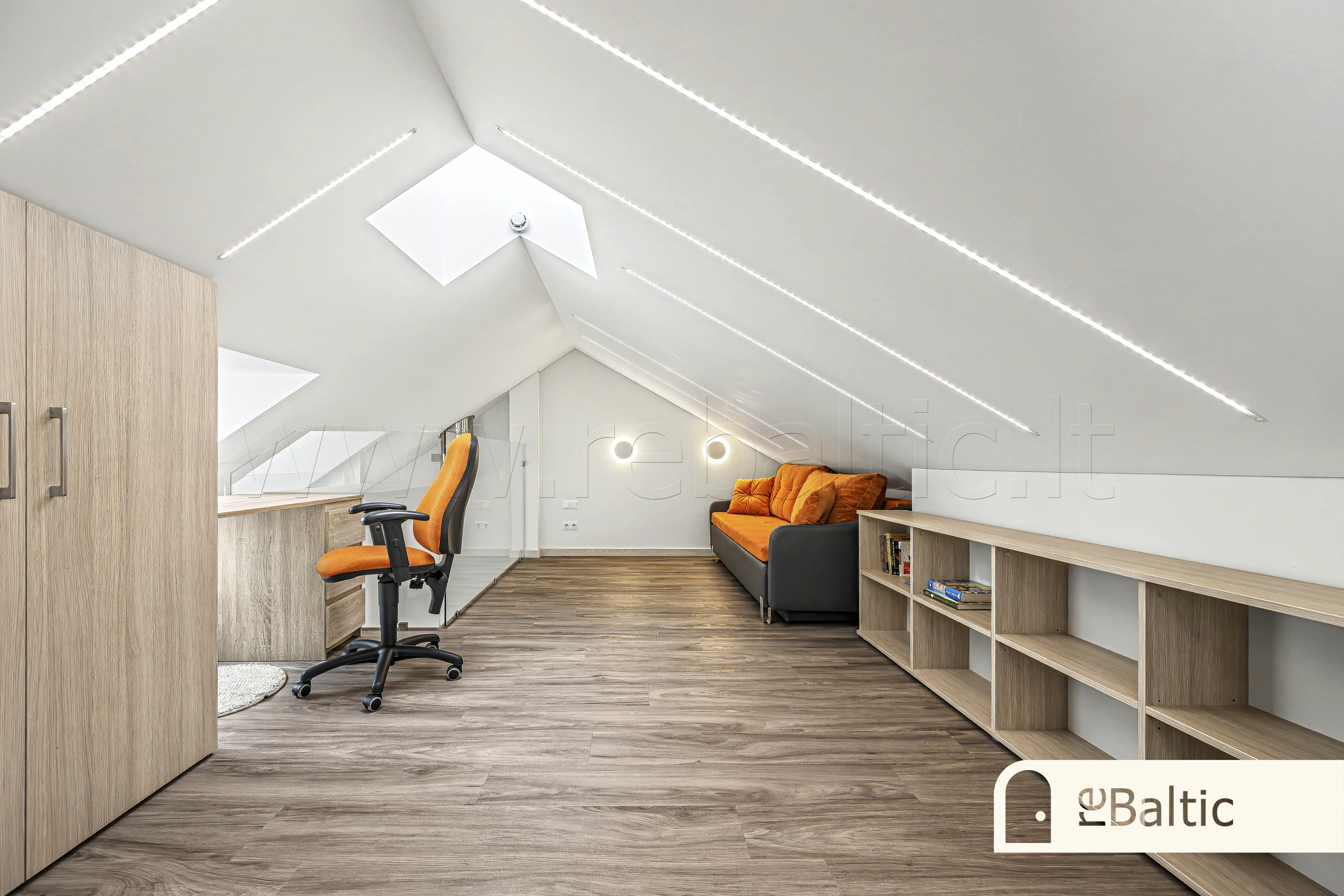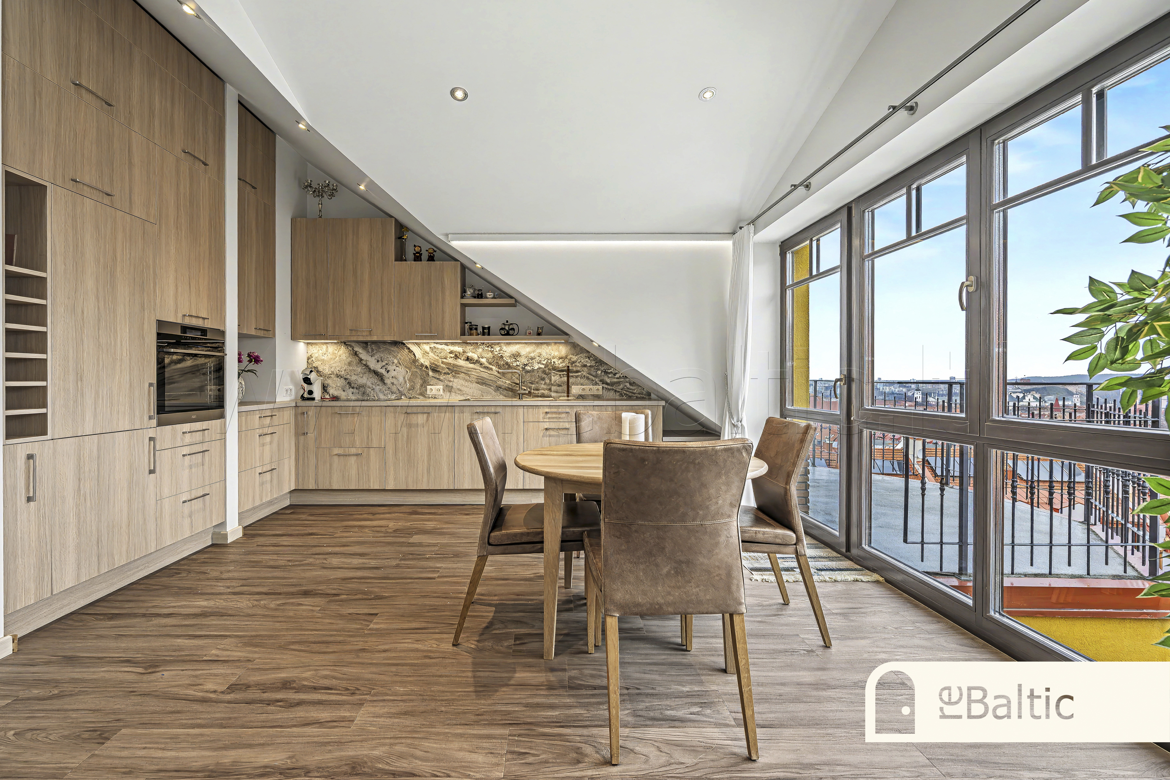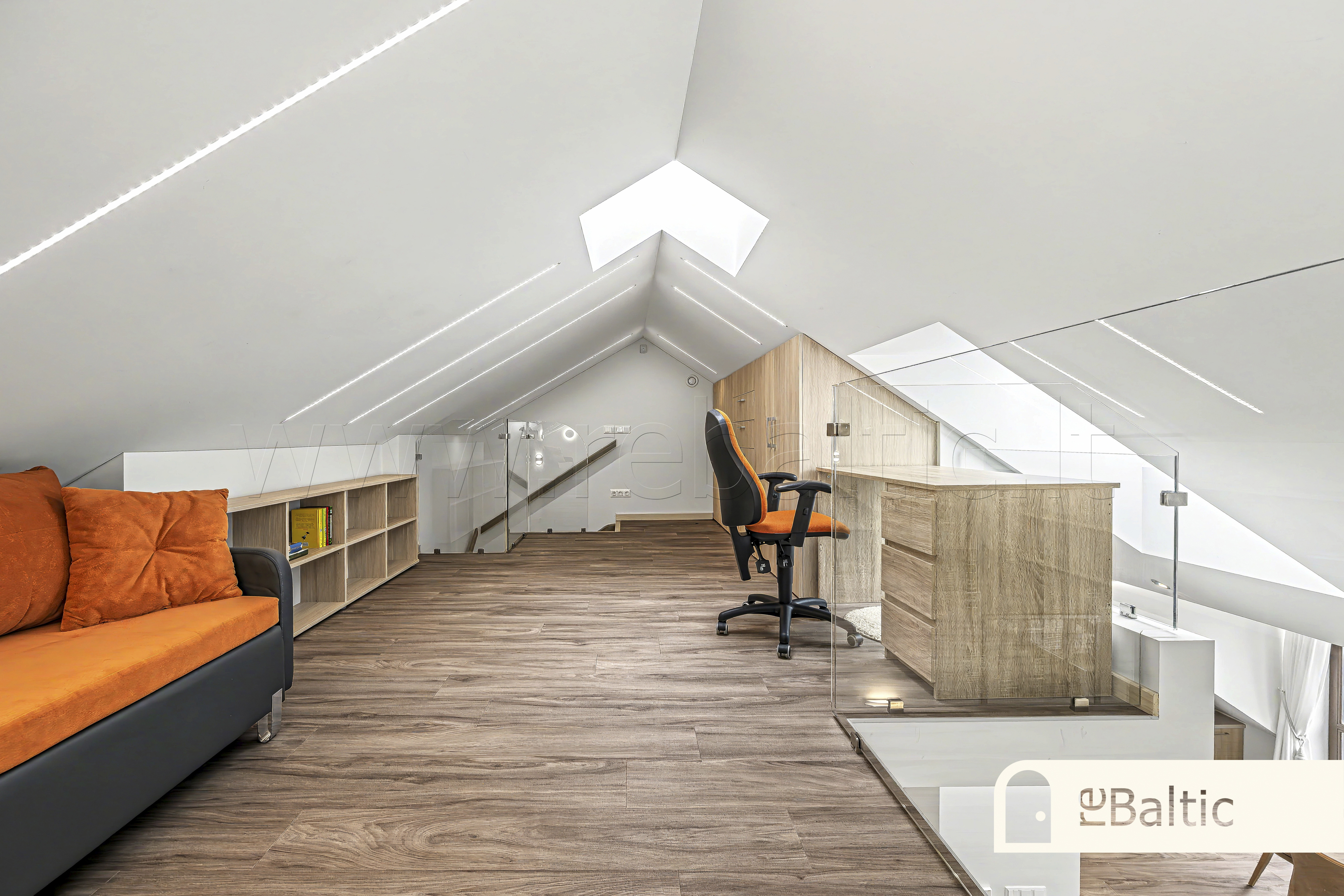 Erdvi svetainė, sujungta su virtuve. Išskirtinė terasa su unikaliais vaizdais. Antrajame aukšte esantis darbo kambarys garantuoja visišką ramybę susikaupimui.