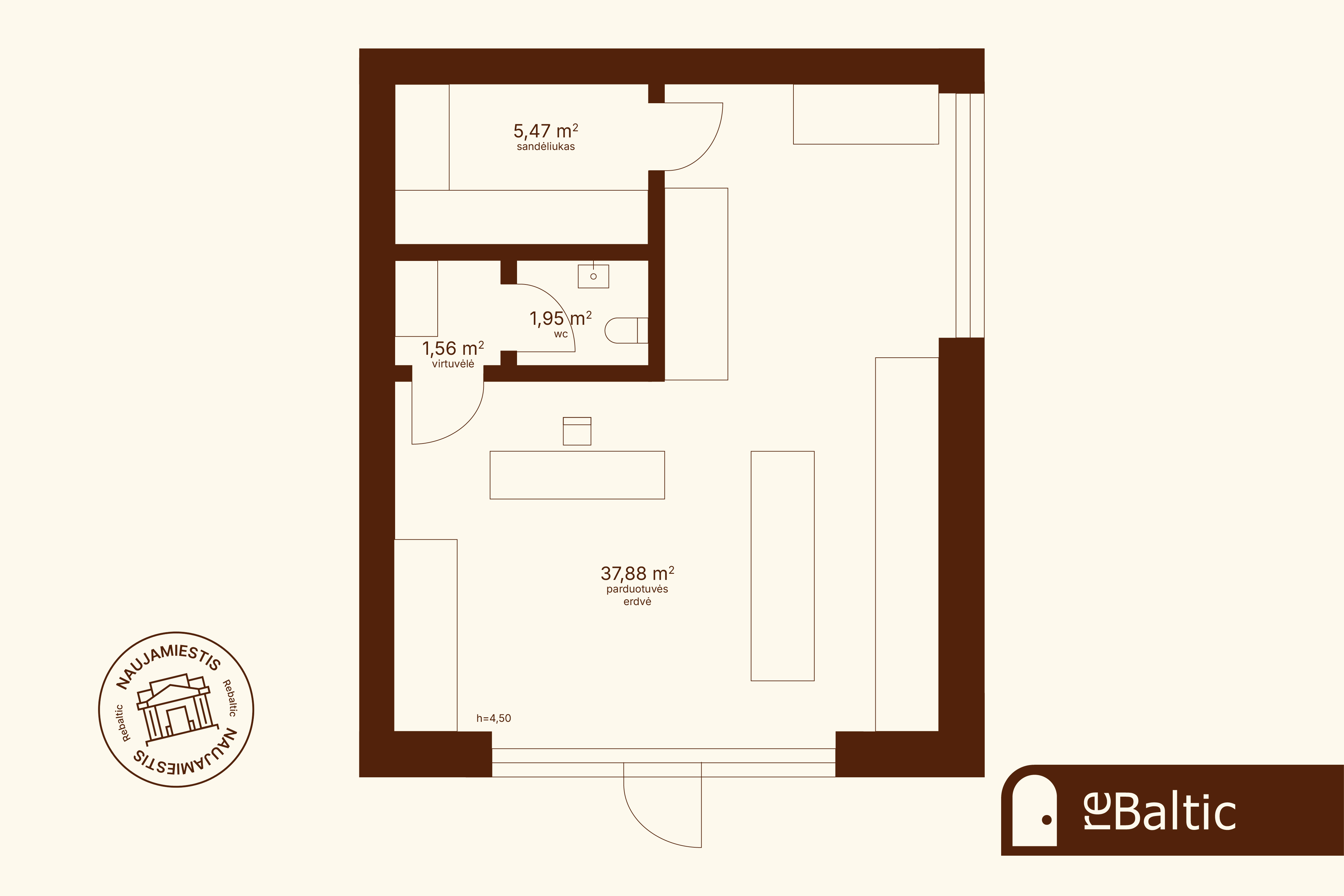 - 37.8 m² pagrindinė erdvė, 5.4 m² ūkinė patalpa, san. mazgas