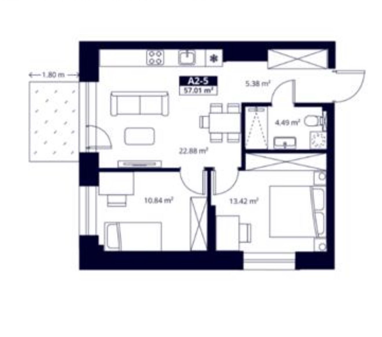 Butas suplanuotas itin funkcionaliai: jauki svetainė sujungta su virtuve, pagrindinis miegamasis, vaiko ar darbo kambarys, patogus vonios kambarys ir balkonas.