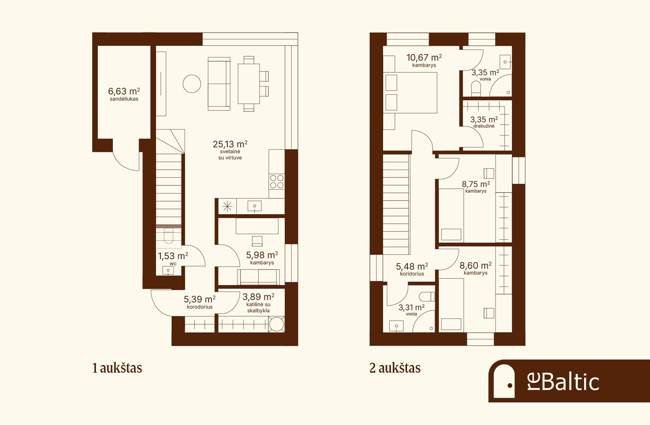 • Pirmas aukštas: erdvi svetainė su virtuve, vaikų/darbo kambarys, WC, vonios kambarys, katilinė su skalbykla, terasa, lauko sandėliukas;