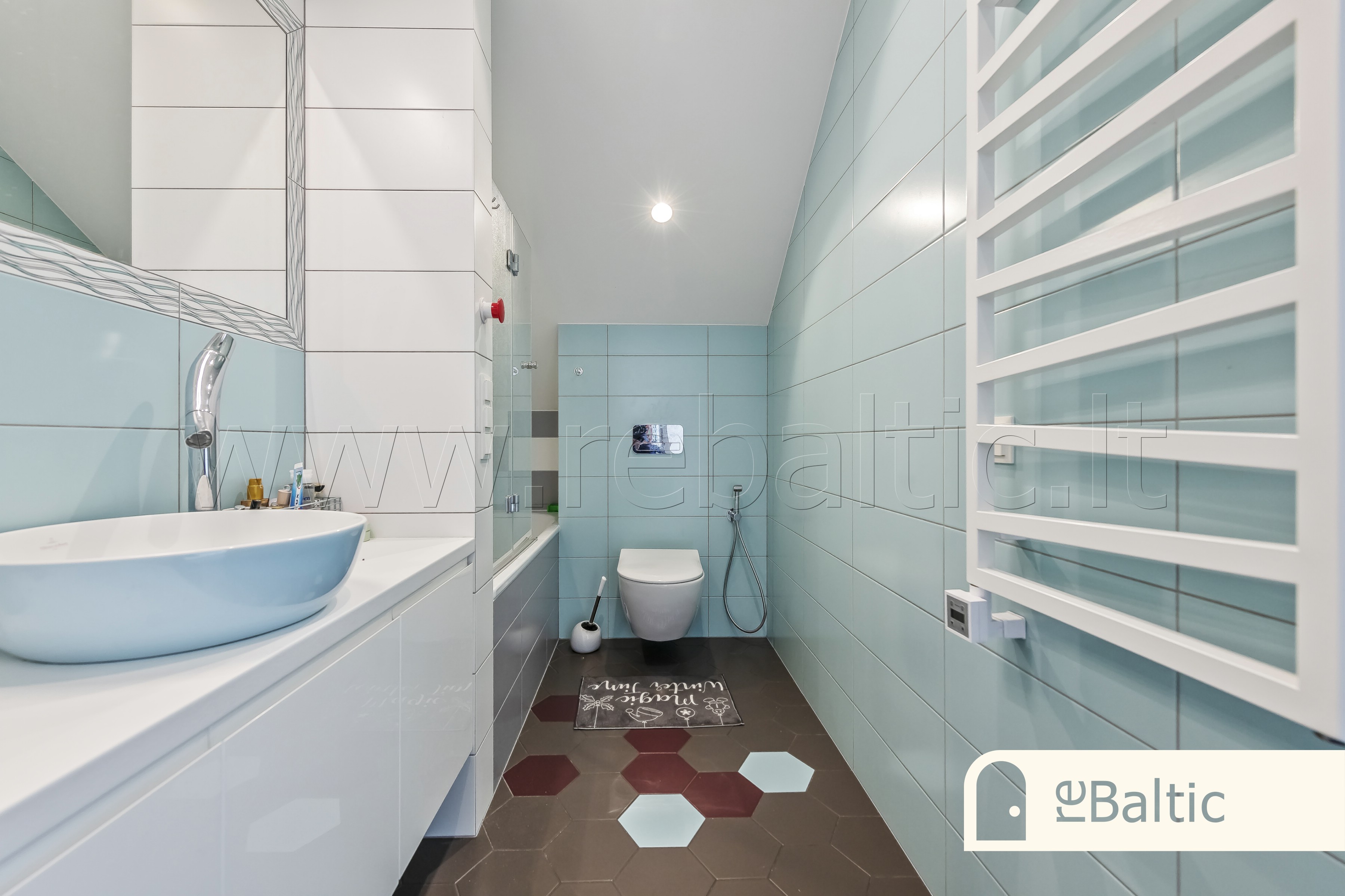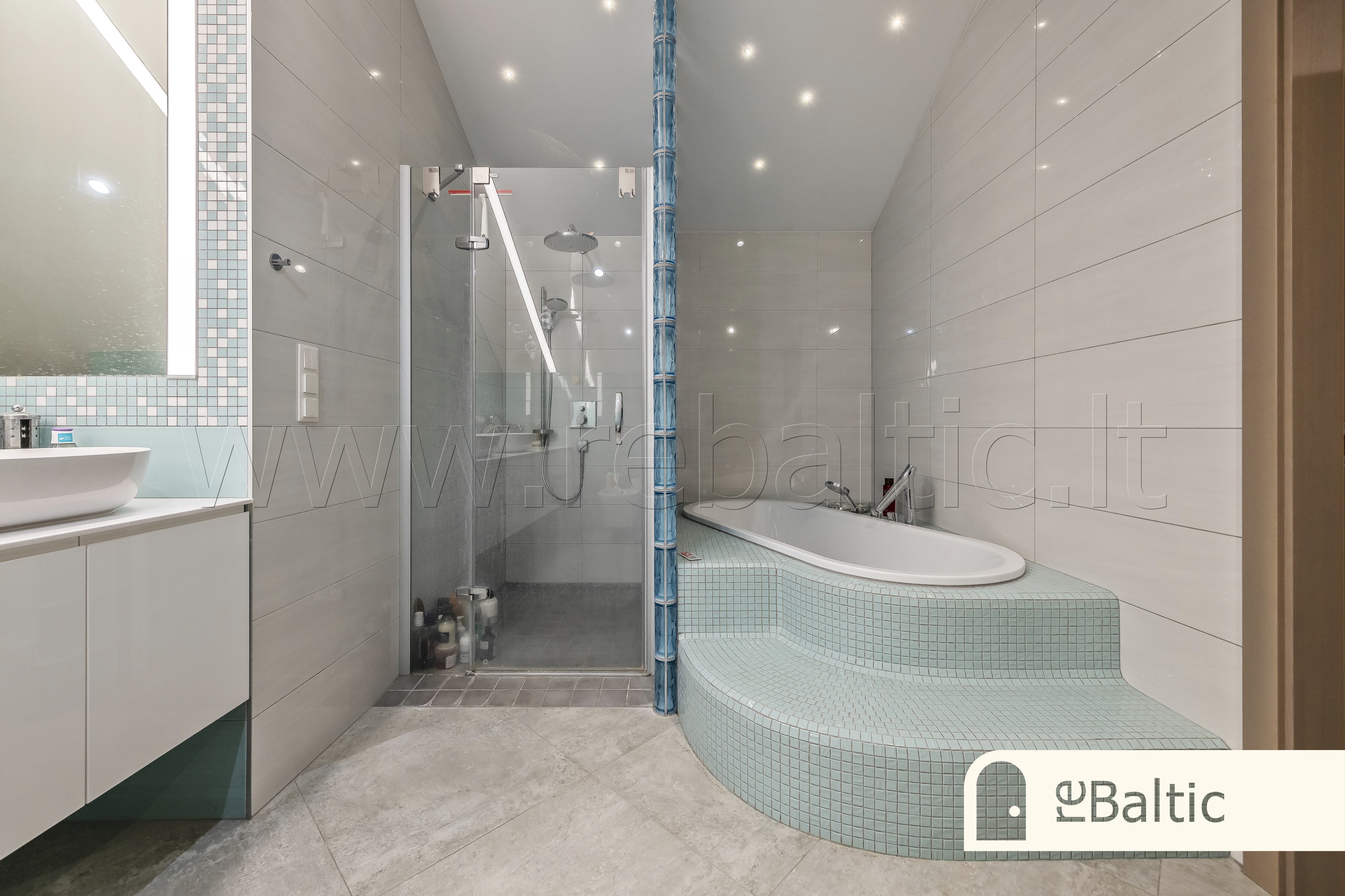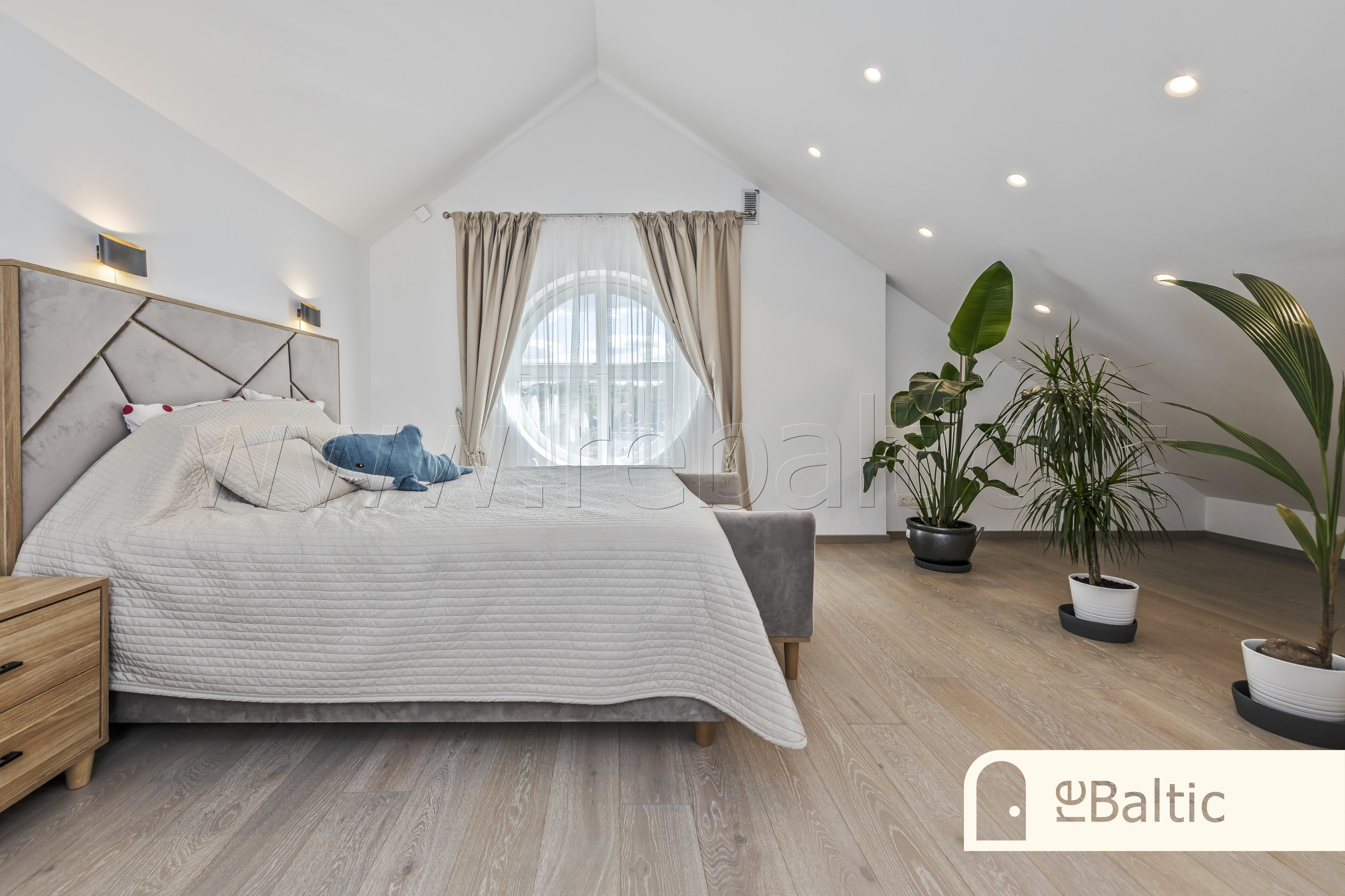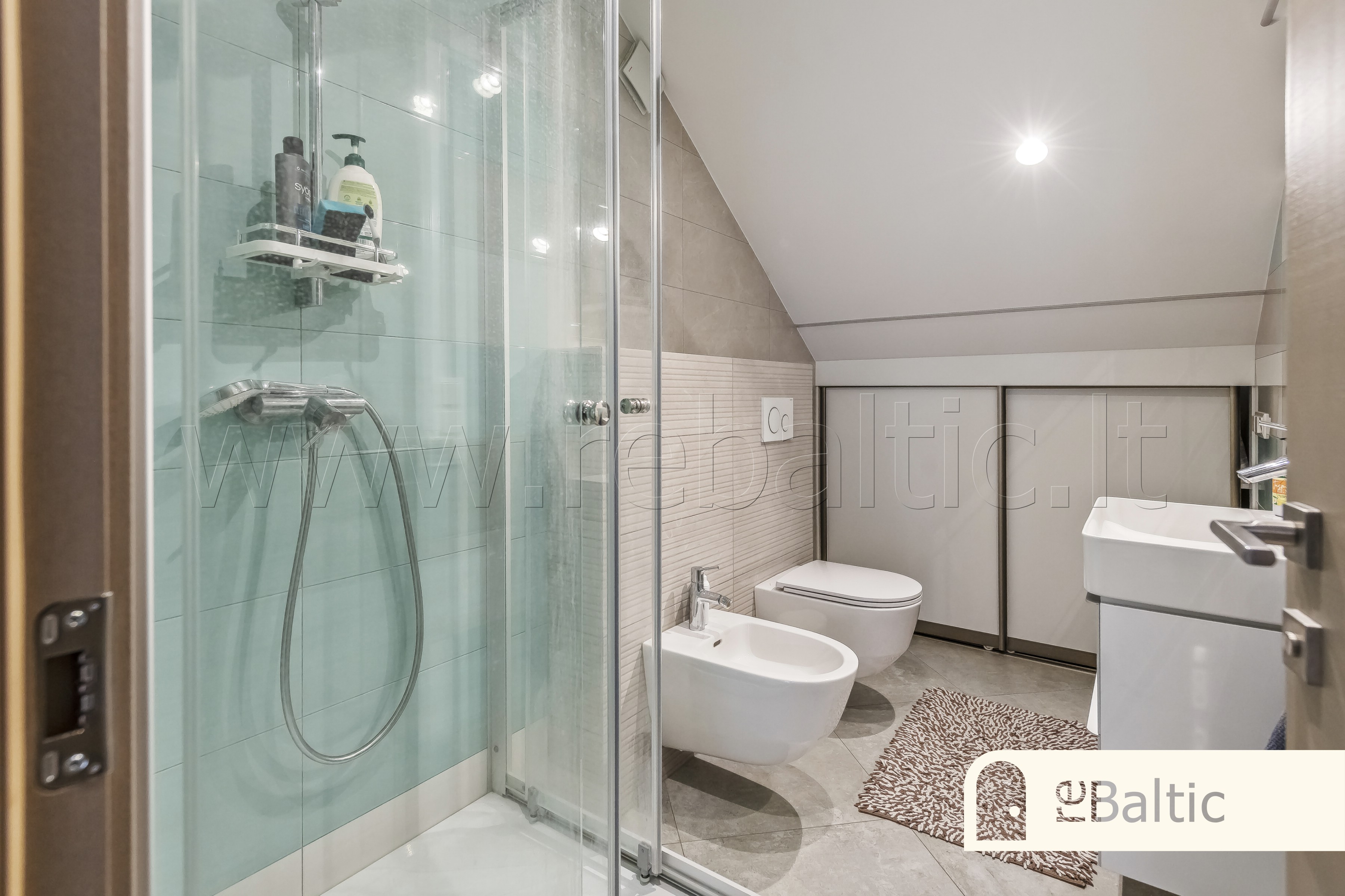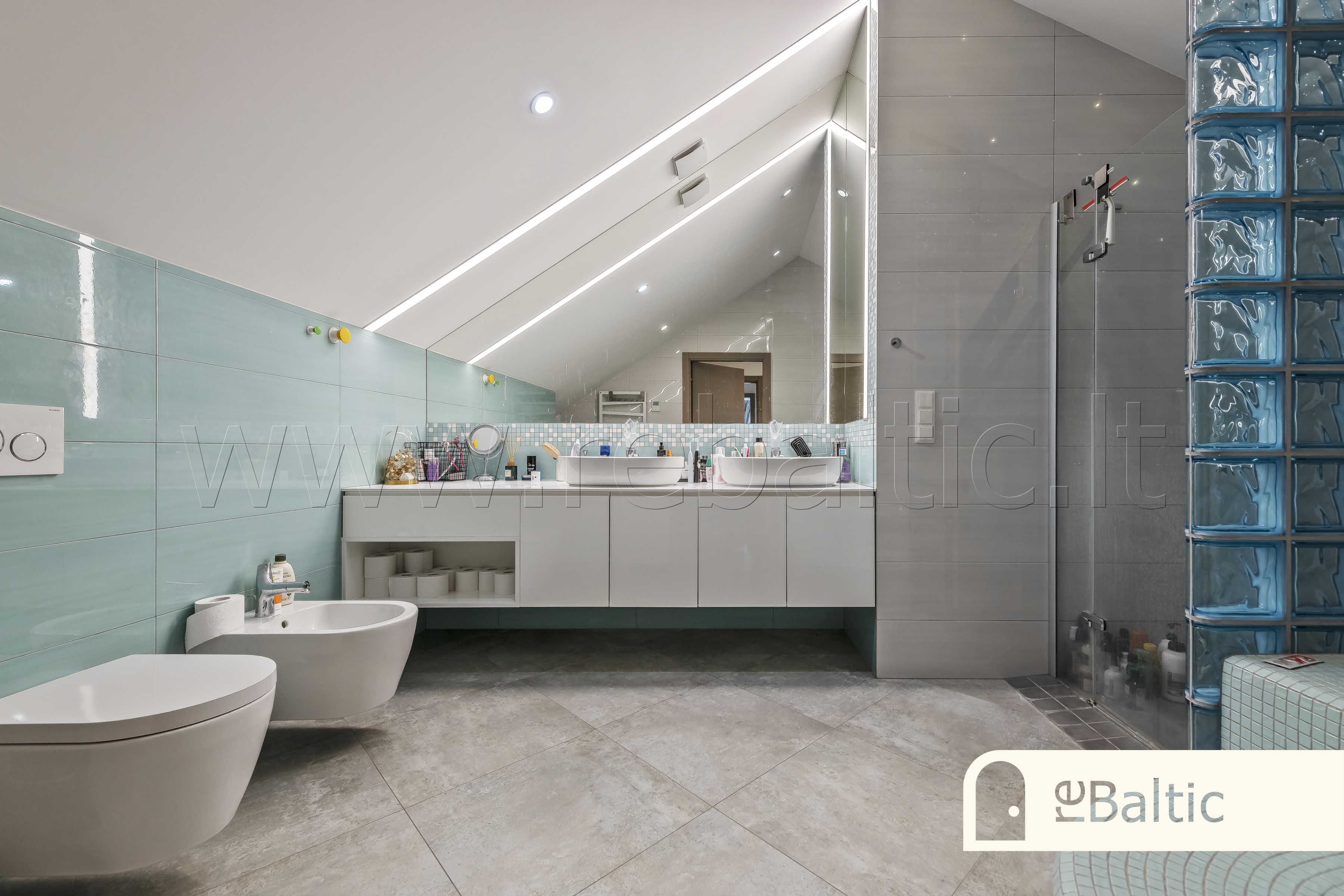 - Antrame aukšte pagrindinis miegamasis su dviem drabužinėmis, pagrindinė vonia su dviem kriauklėmis, vonia, dušu, bidė, WC, skalbimo patalpa