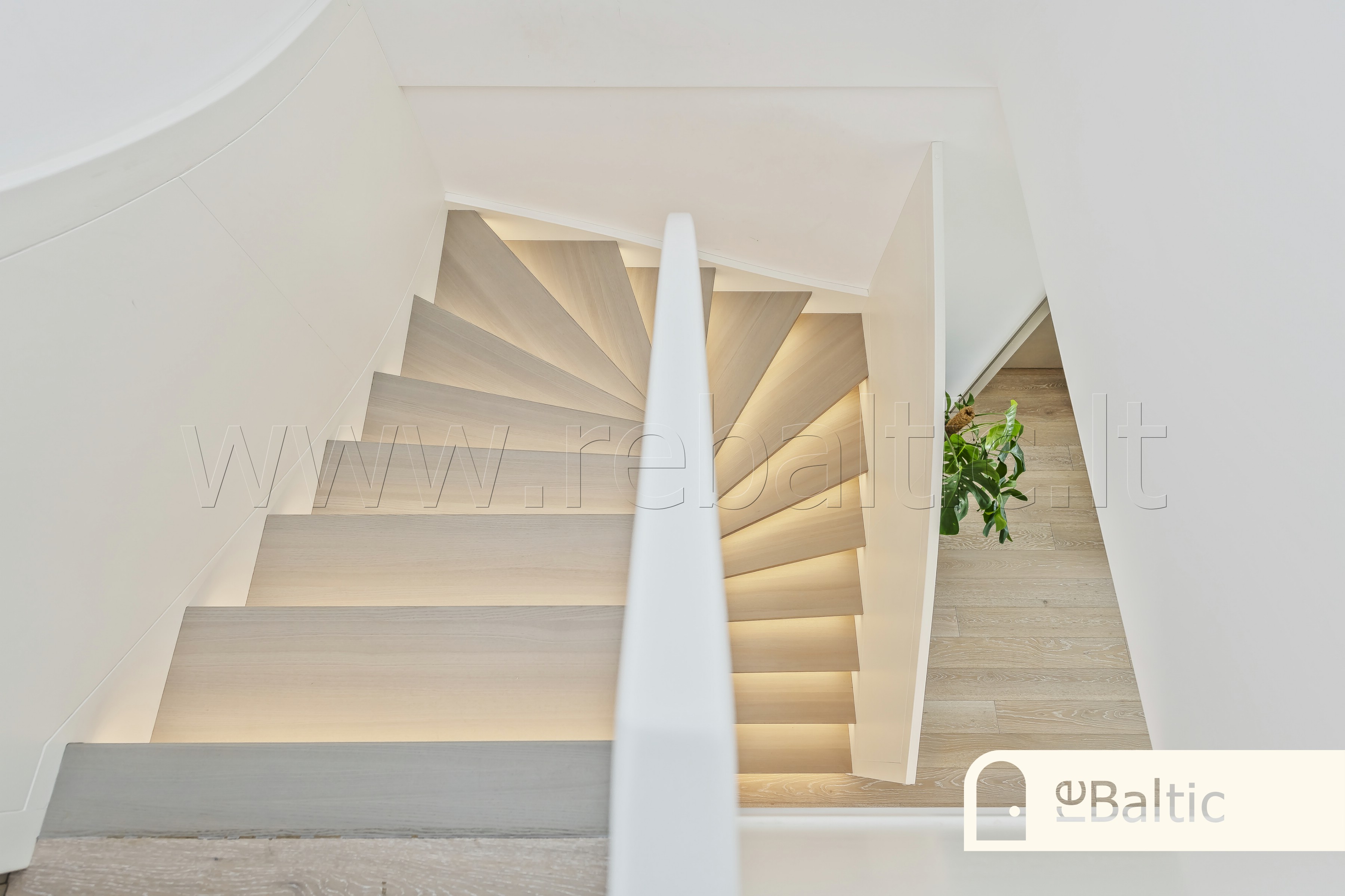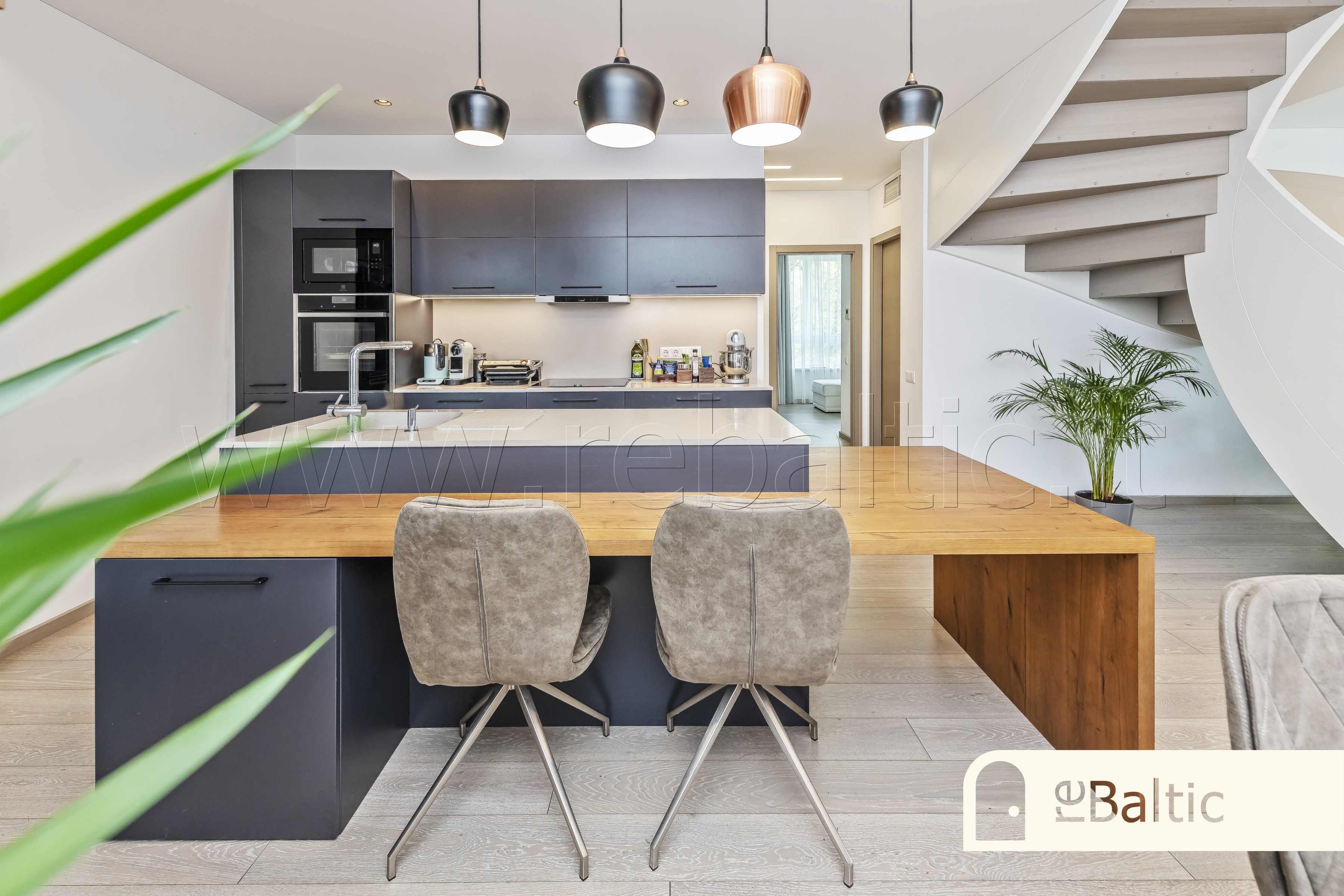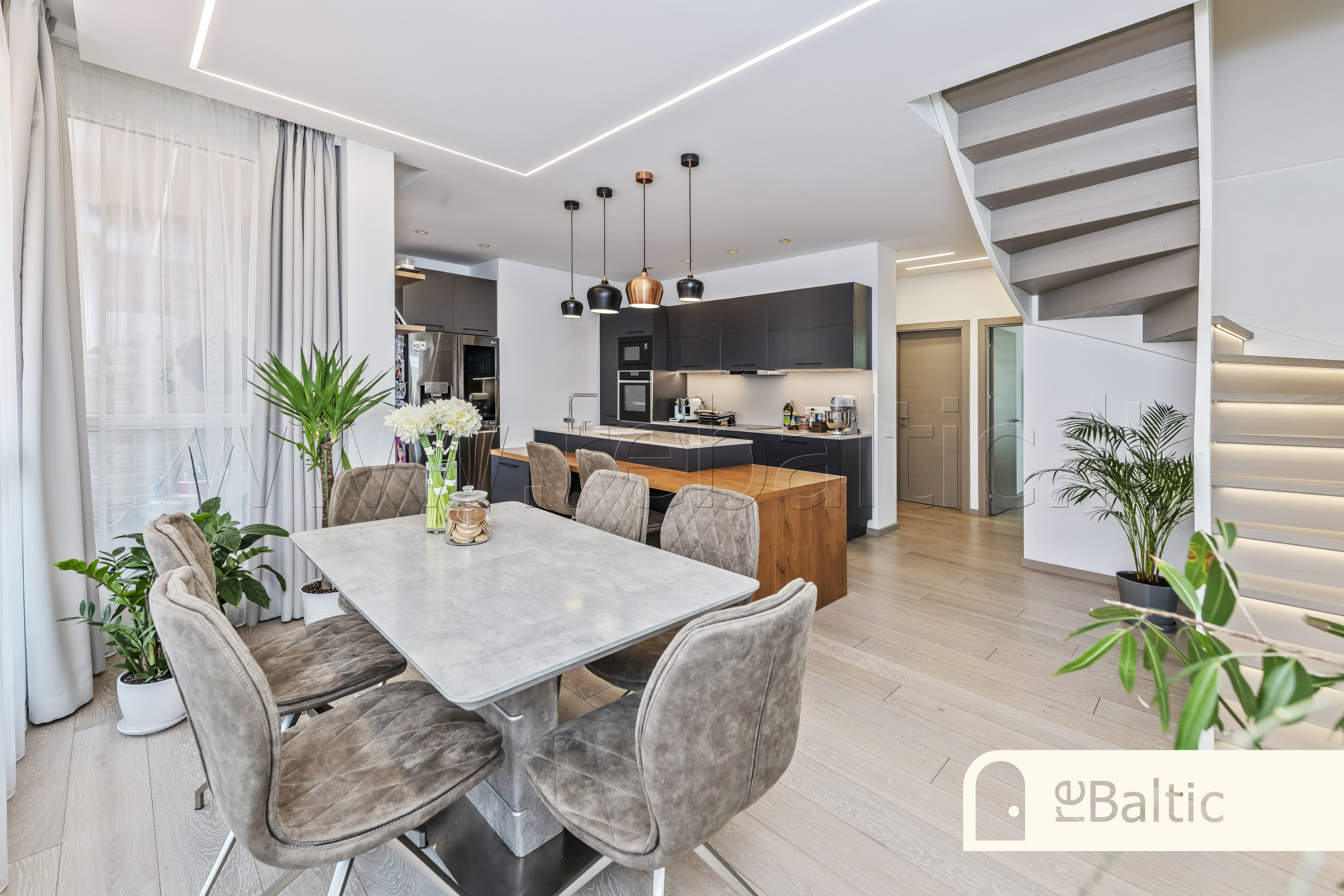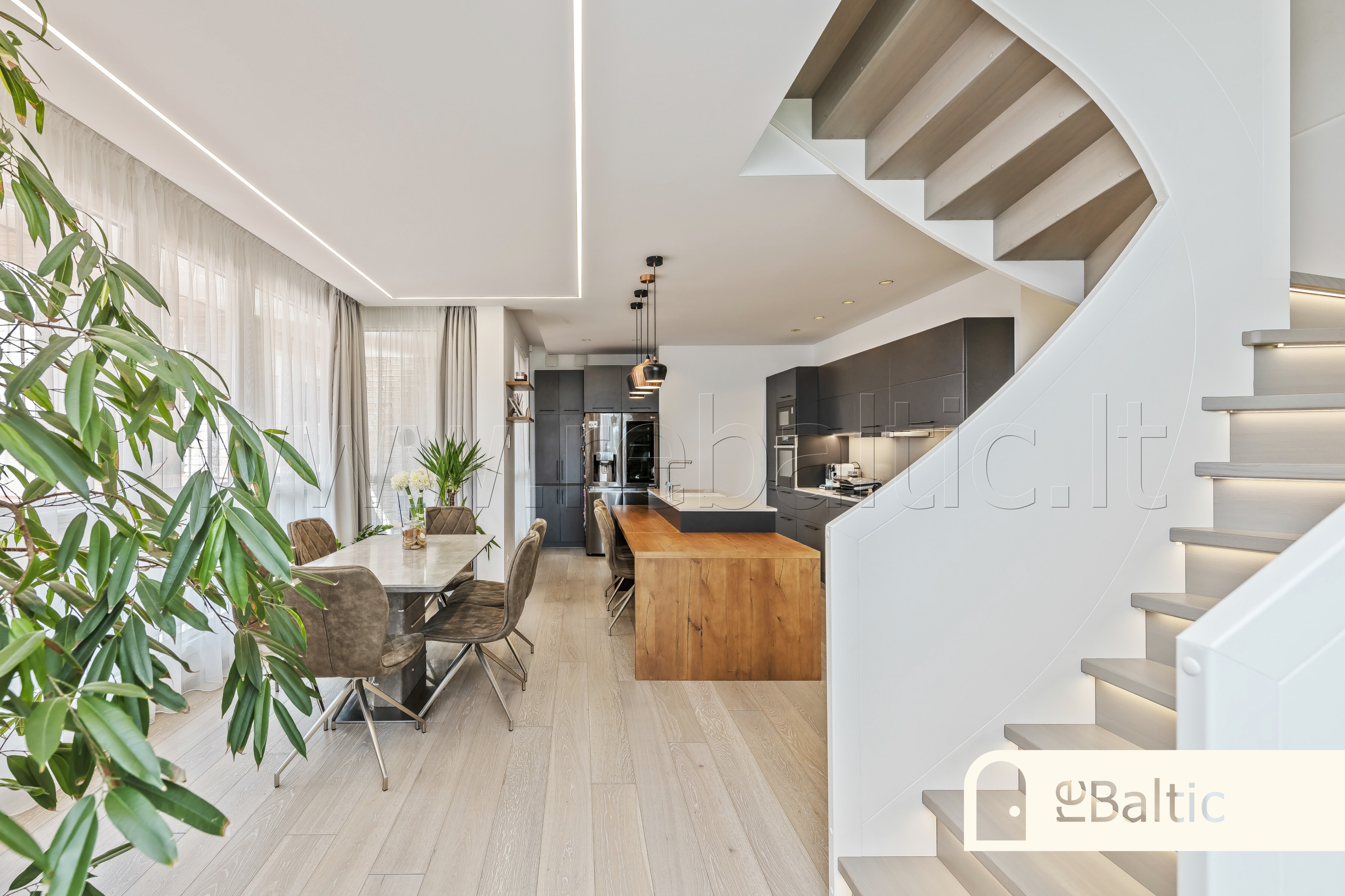 - Virtuvės ir valgomojo zona dalinai atskirta nuo svetainės moderniais laiptais