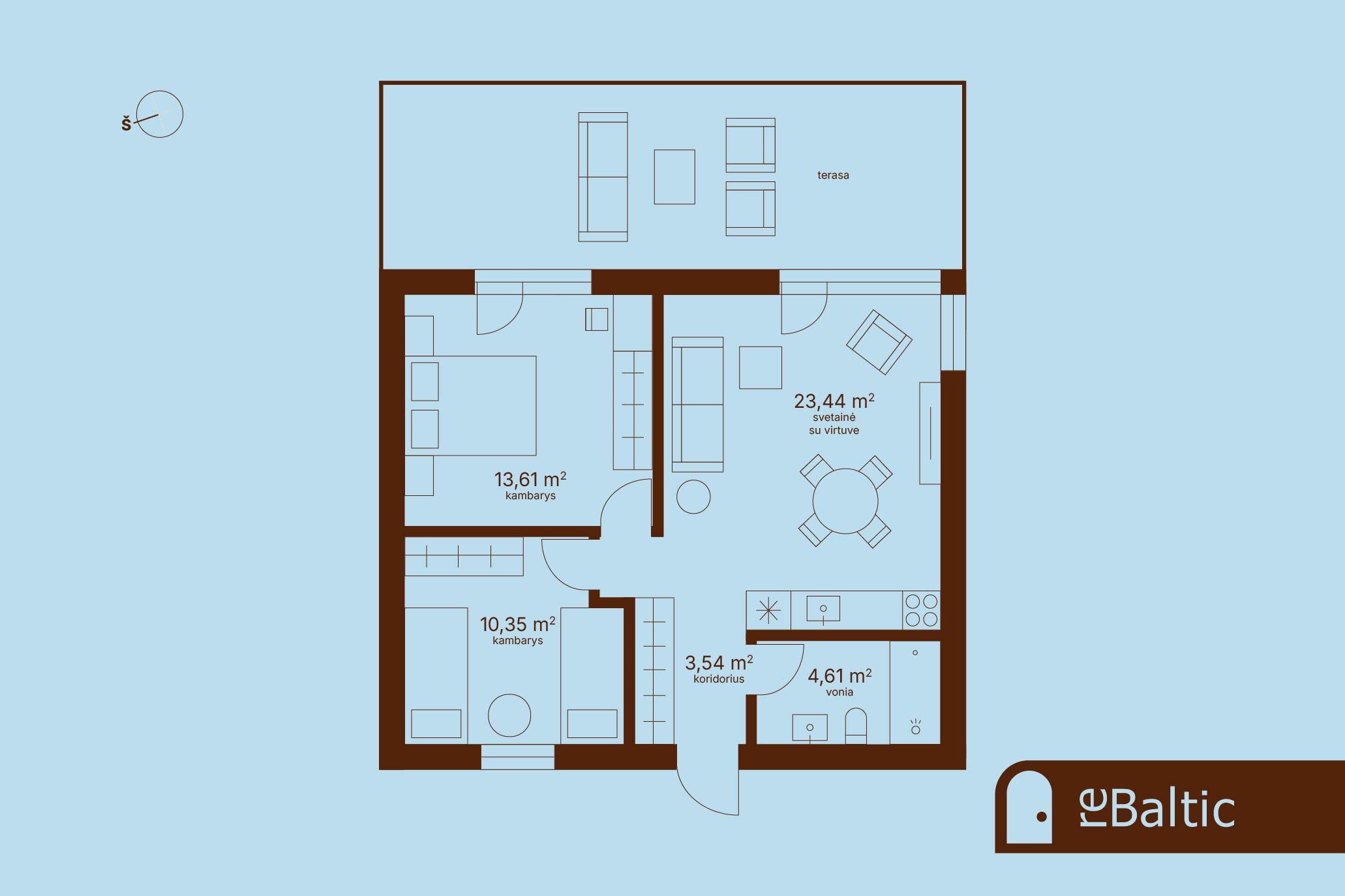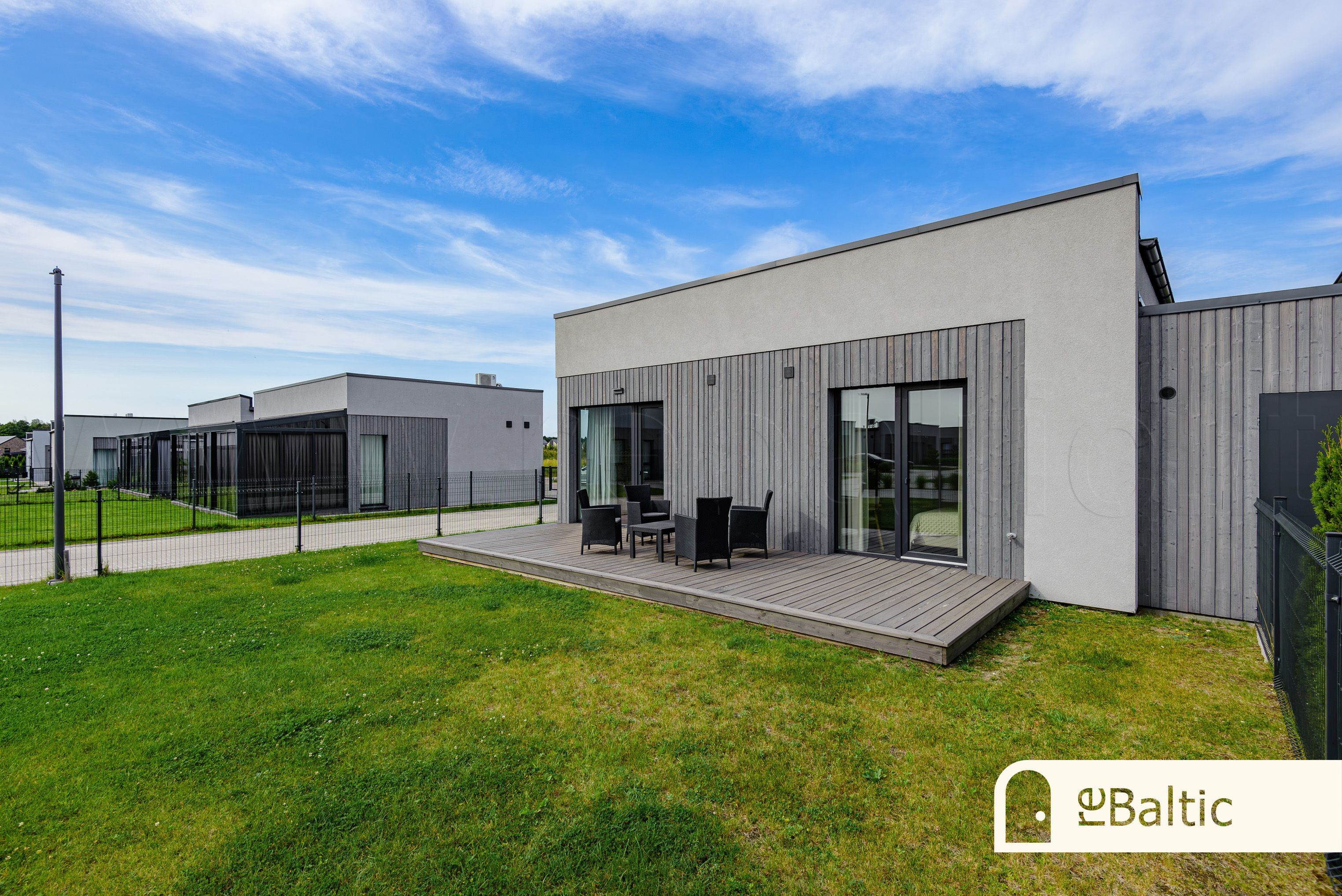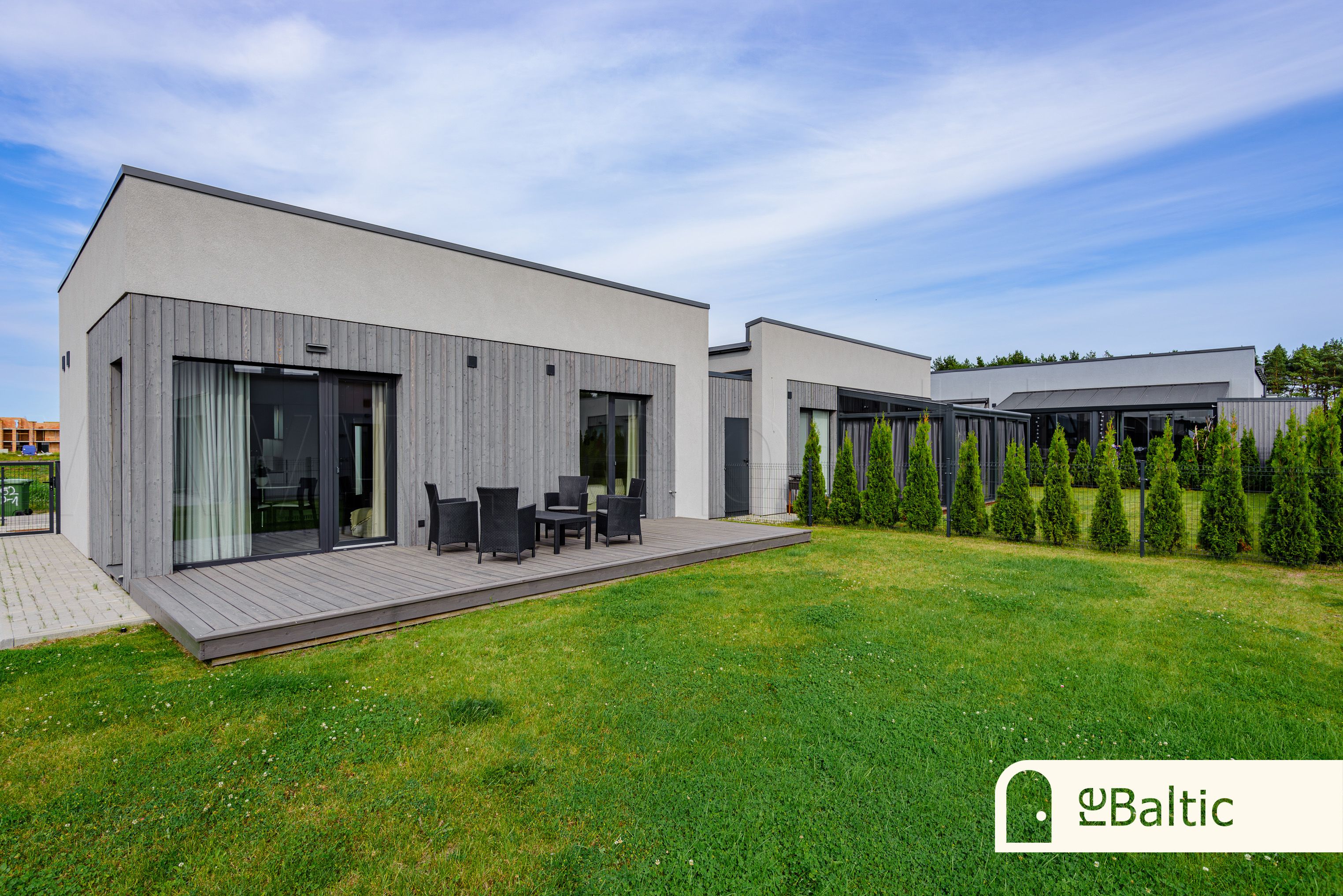 - Didžiulė terasa per visą namo ilgį, orientuota į saulėtąsias pietų ir vakarų puses