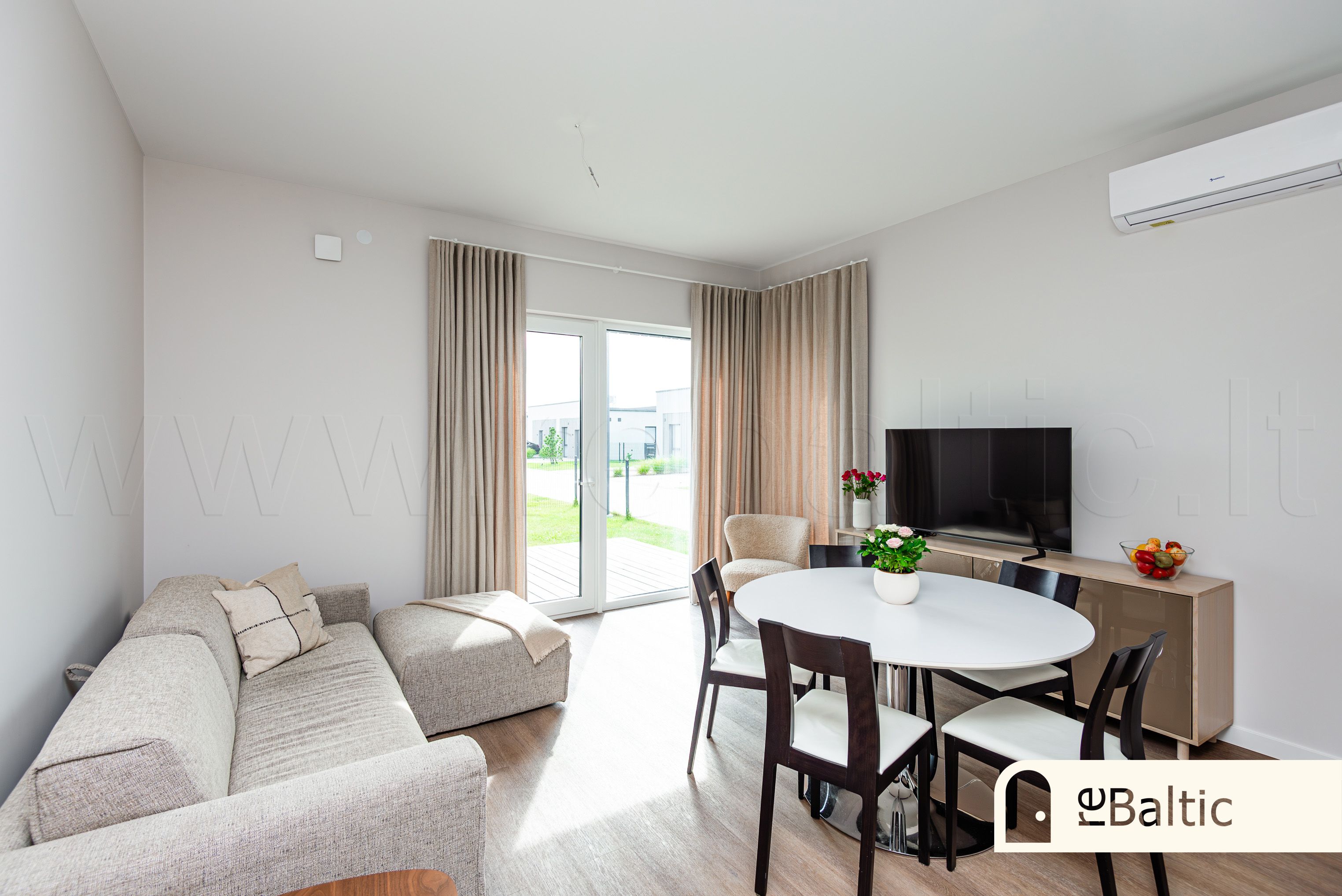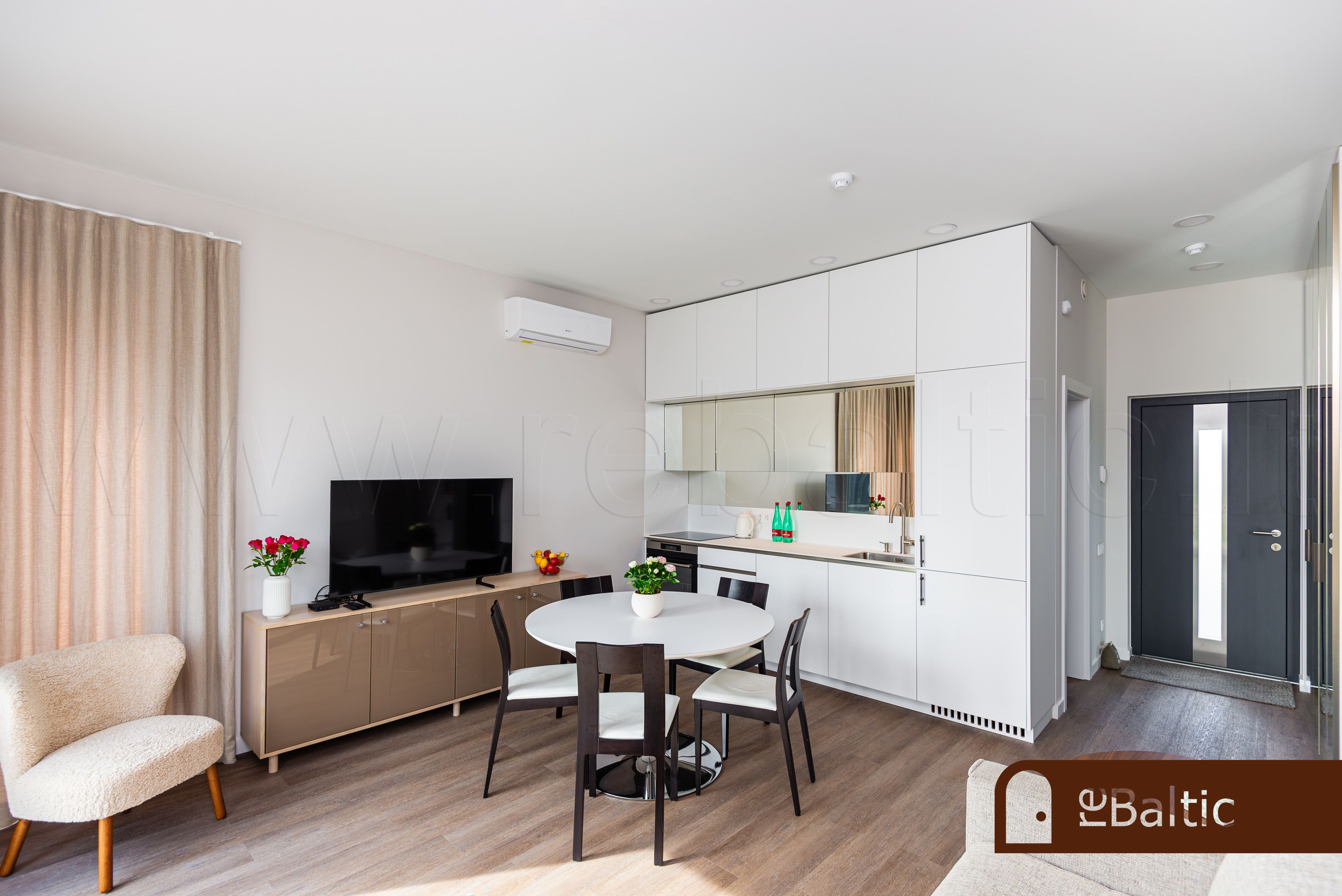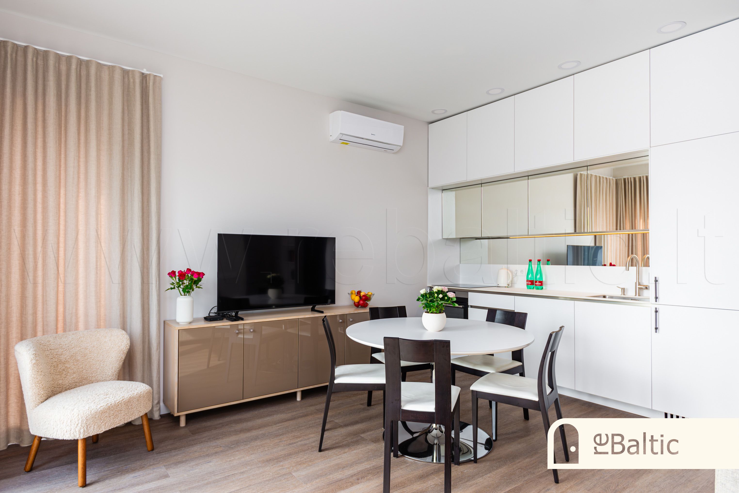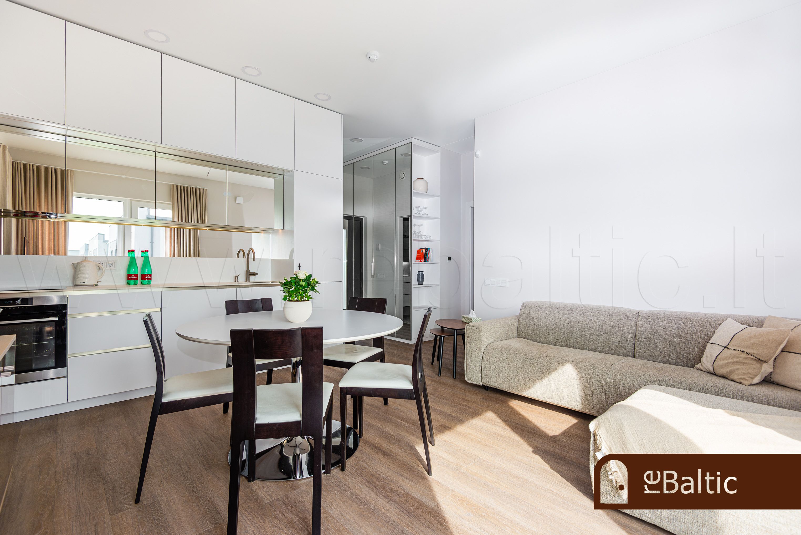 - Svetainė vienoje erdvėje su virtuve. Veidrodinis virtuvės fasadas išplečia svetainės erdvės pojūtį.
