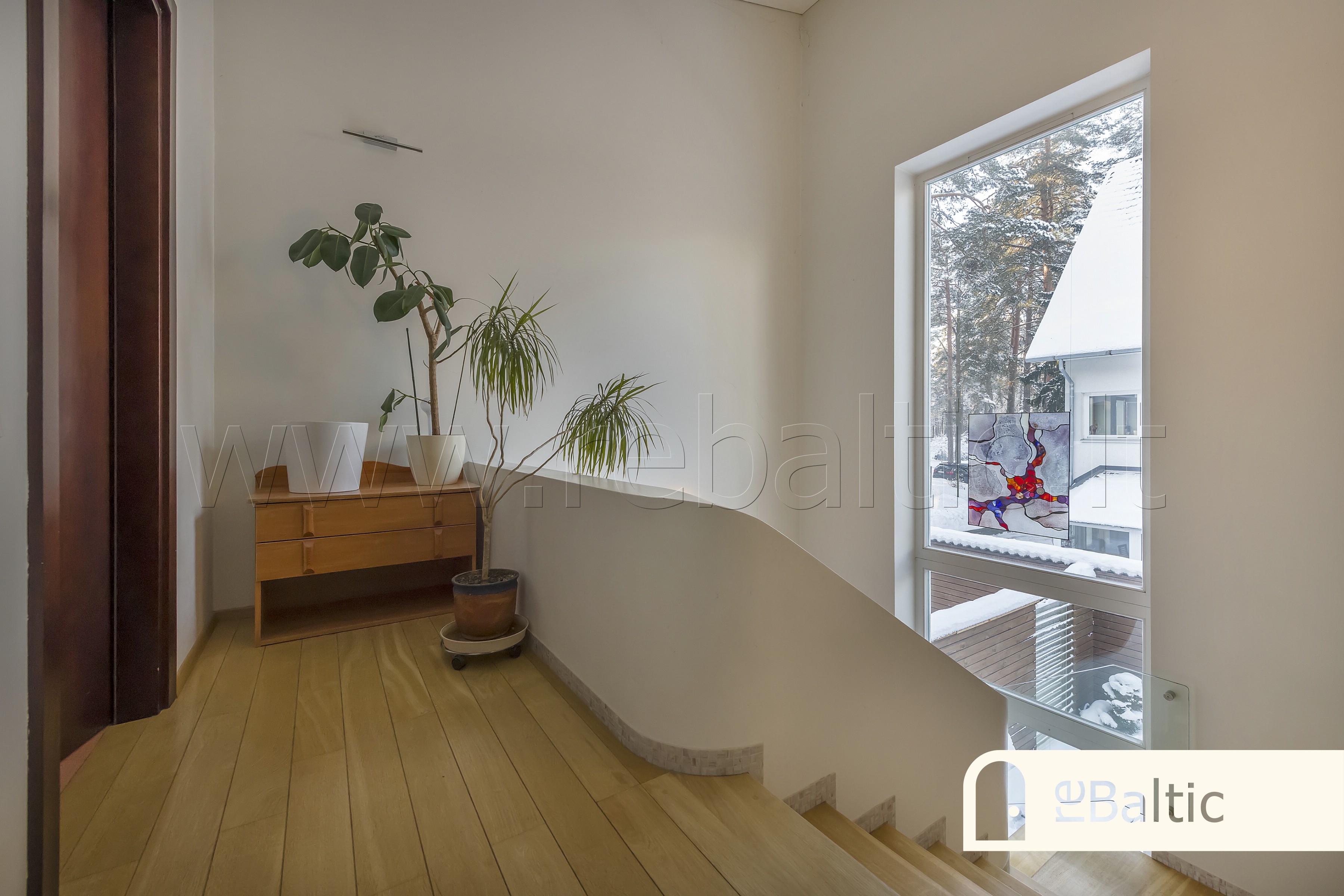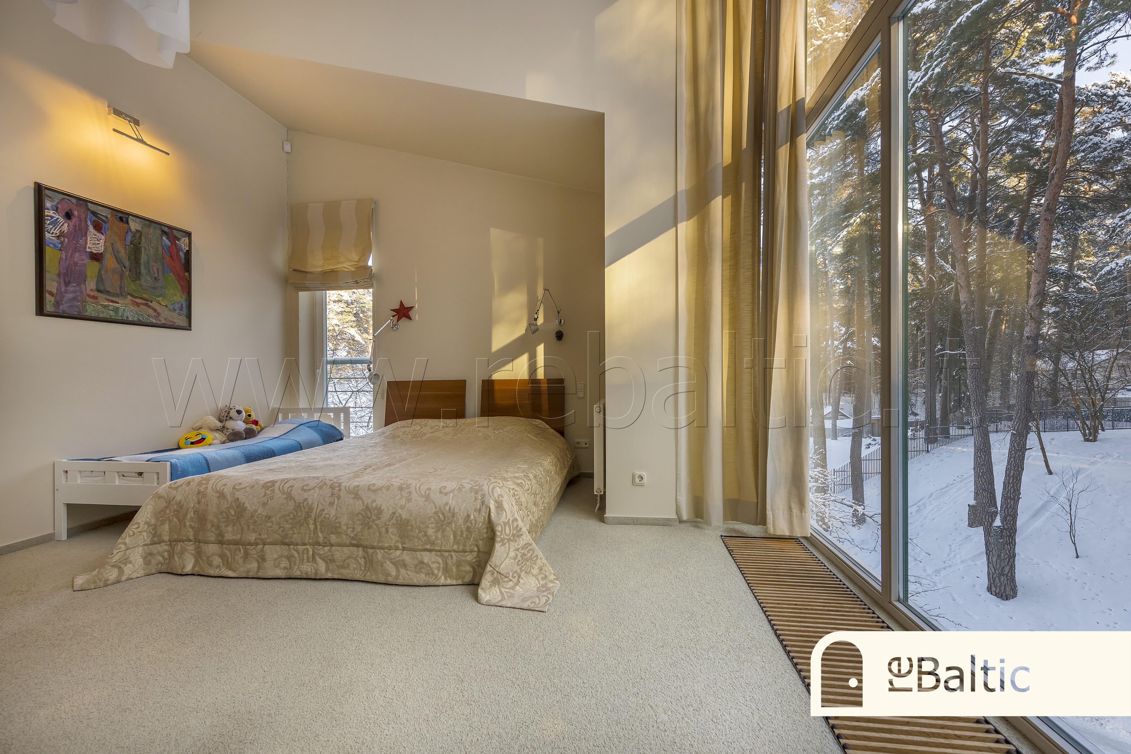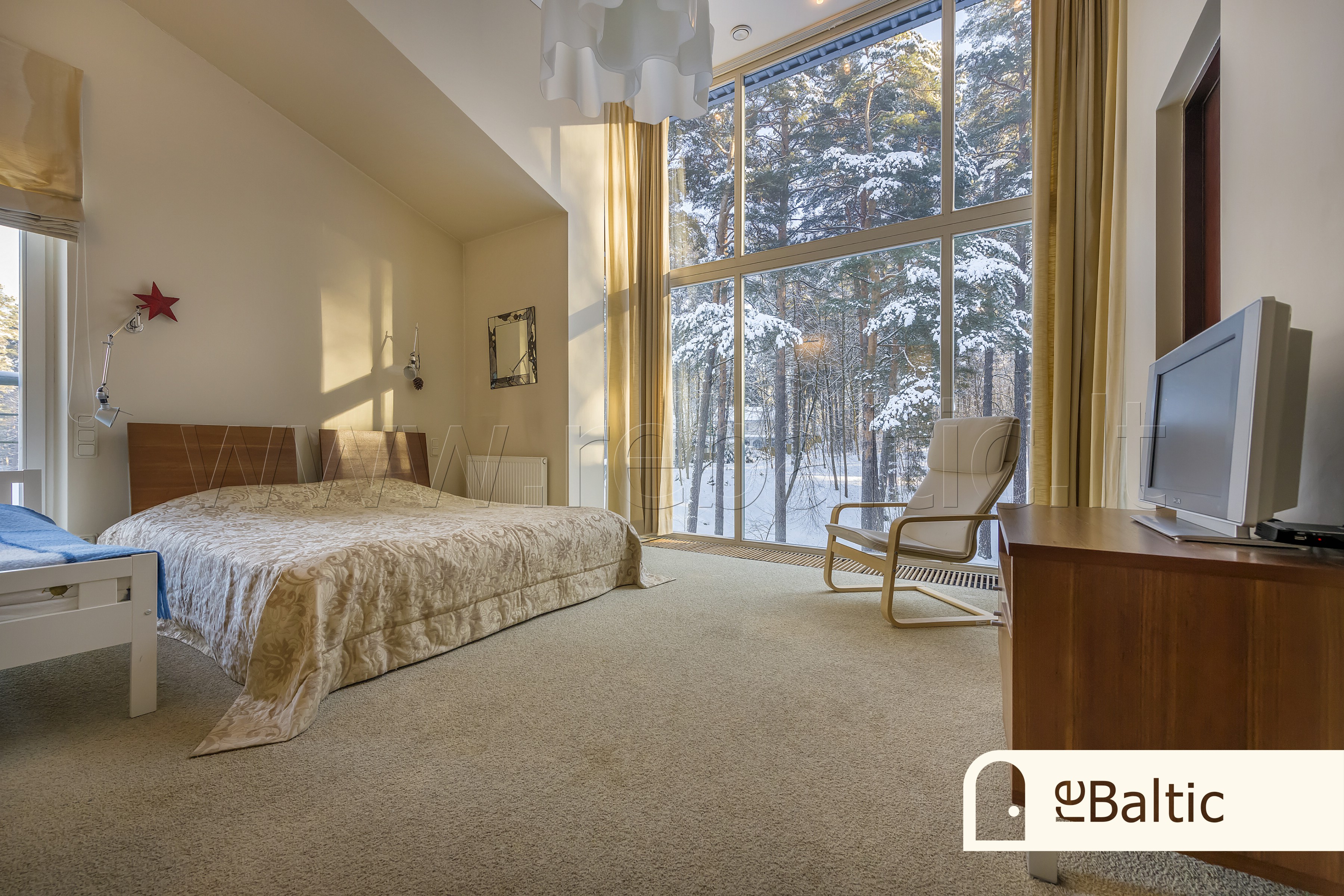 - Trečiame aukšte pagrindinis miegamasis įspūdingo aukščio lubomis ir vaizdais į mišką, su nuosava vonia ir drabužine, dar du miegamieji kambariai, antras vonios kambarys.